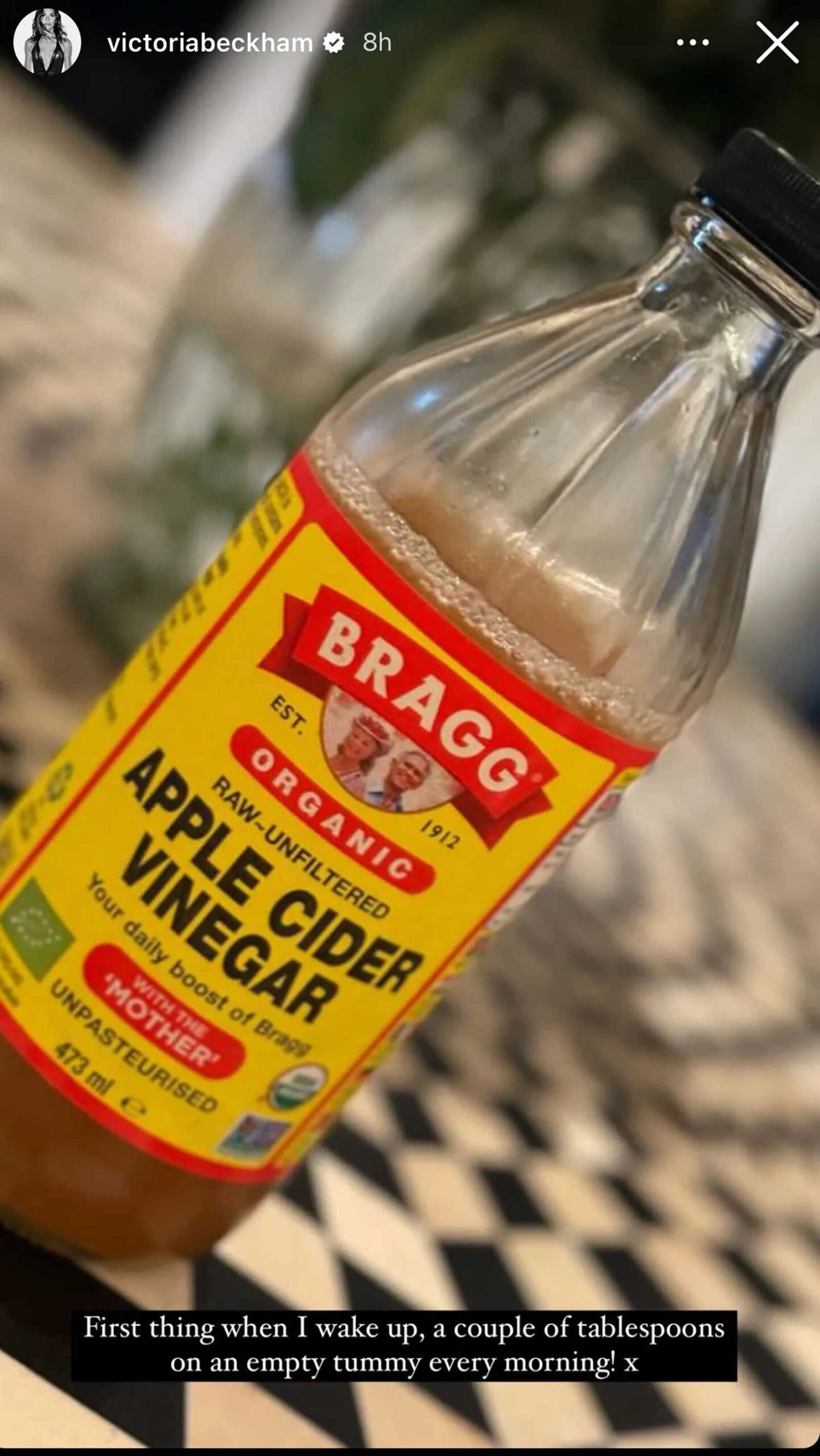 Posting a snap of Bragg’s organic, raw and unfiltered apple cider vinegar, VB explained that the first thing she does upon waking is take “a couple of tablespoons on an empty tummy.” A natural remedy that helps to balance blood sugar, support digestion and boost the immune system, apple cider vinegar has had a renaissance recently–just be sure to take yours raw and organic for maximum health benefits. While VB takes hers straight, most experts recommend mixing with water to prevent the erosion of tooth enamel.