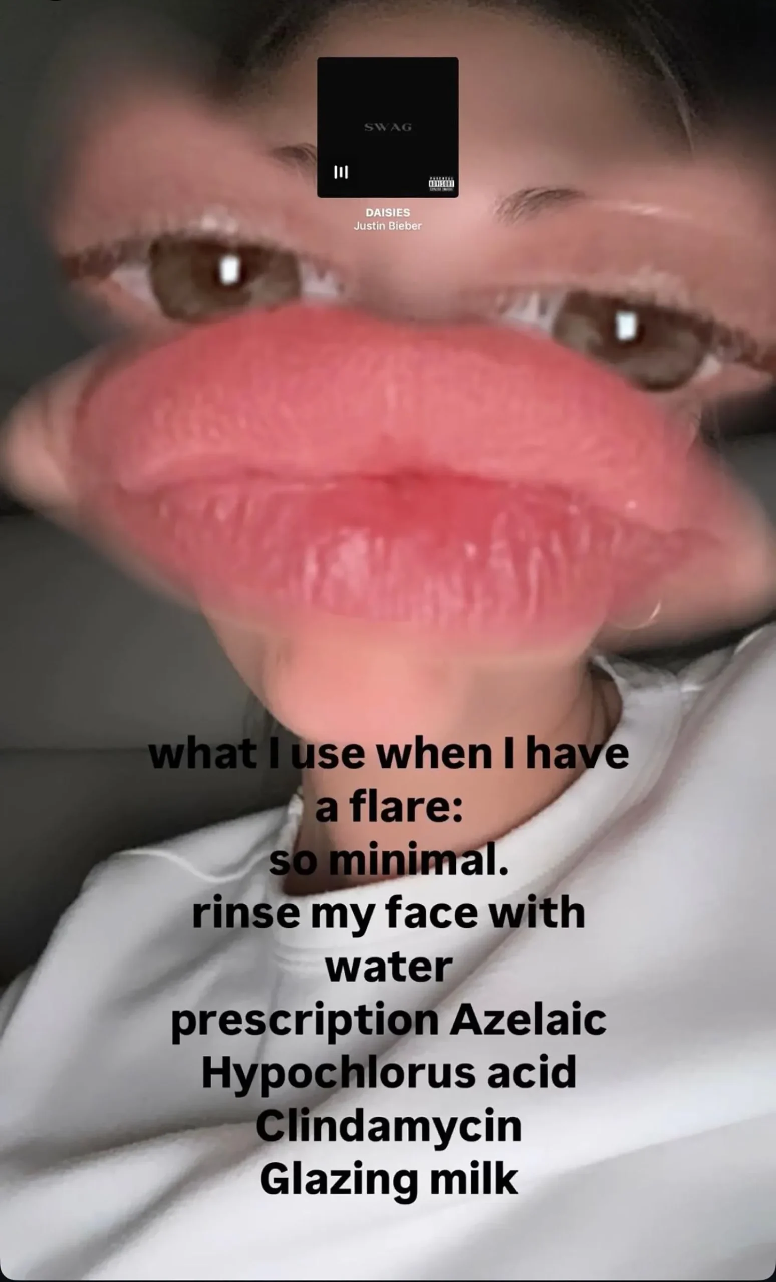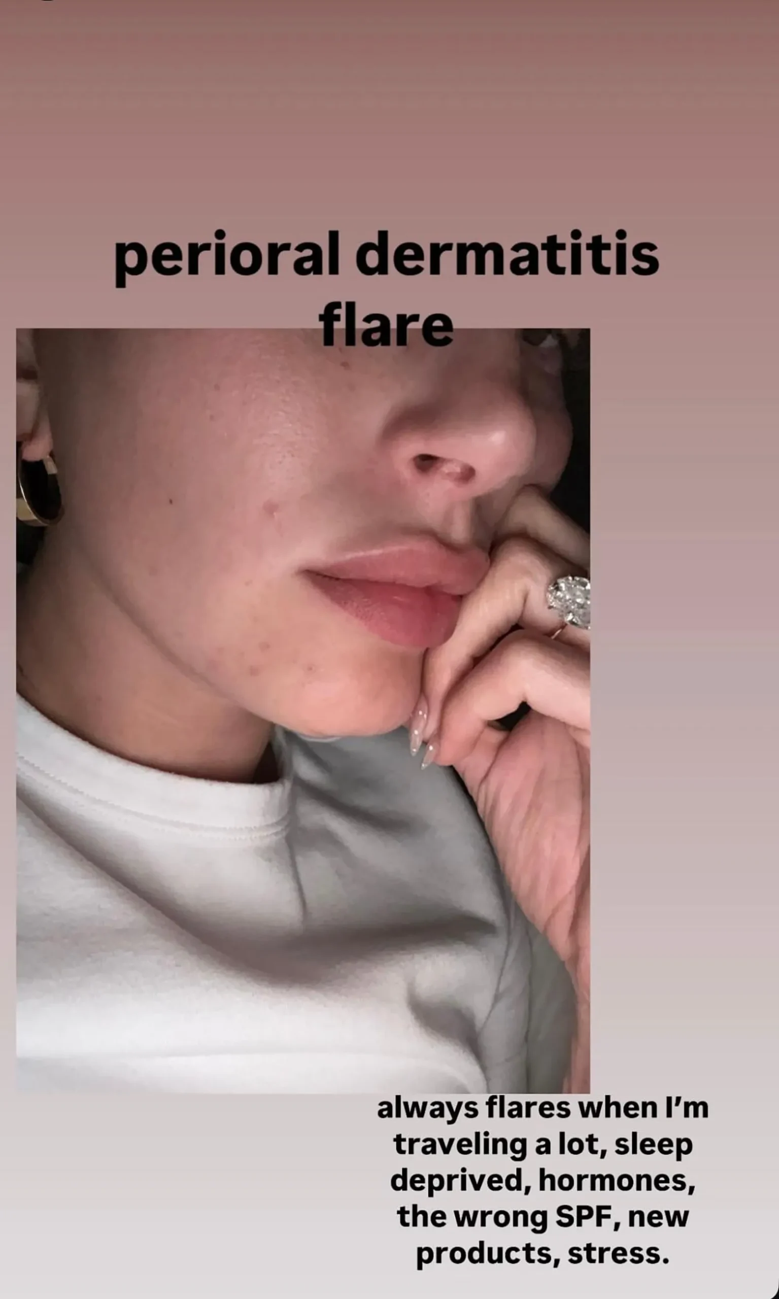 Bieber took to her Instagram Story to share her recent experience of a perioral dermatitis flare up, posting a makeup-free selfie to show the small bumps and texture on the lower half of her face. She captioned her Story saying that it “always flares when I’m traveling a lot, sleep deprived, hormones, the wrong SPF, new products, stress.” Derms can’t be totally sure yet what causes DP—the research isn’t there yet—but plenty of DP sufferers will say similar. (This writer included—anything from a new product gifted to me at Christmas that has some fragrance or actives I’ve been unacquainted with, to a few summer holidays, or a particularly stressful stretch of work can stir the bumpy skin).