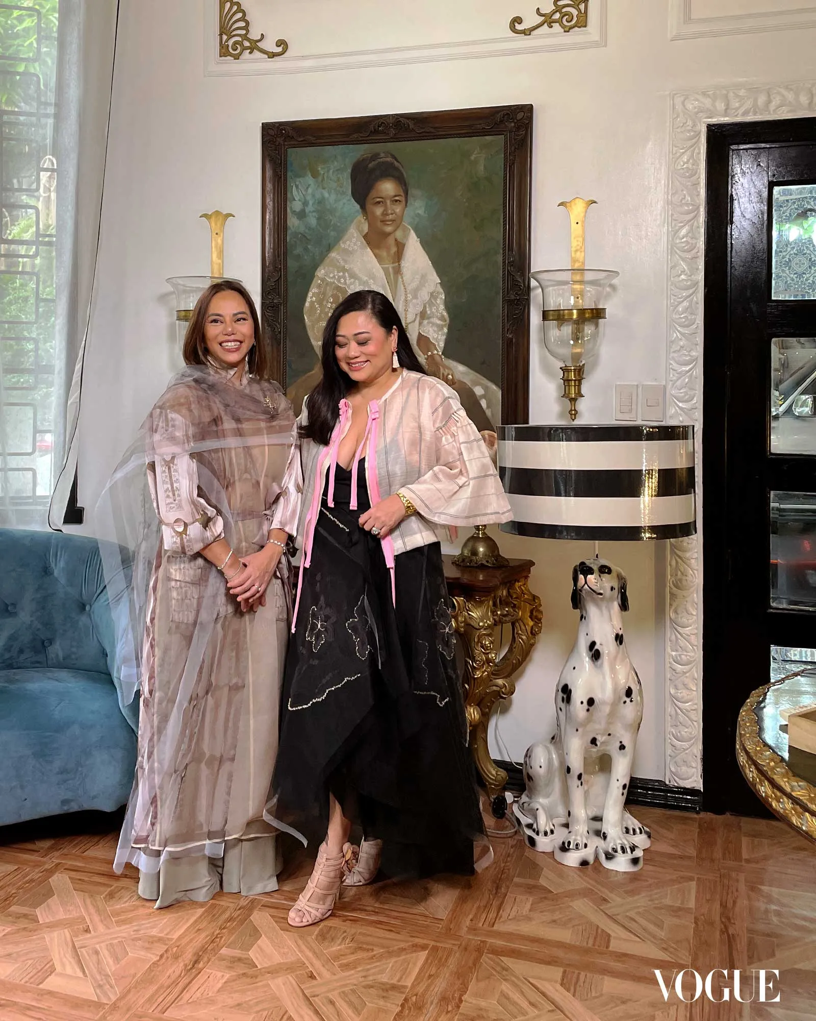The team had initially suggested pastel tones for the shoot, but the sisters arrived wearing coordinated ensembles by Jo Ann Bitagcol to echo the colors of their heritage home. “It turned out even better,” Almazan laughs.