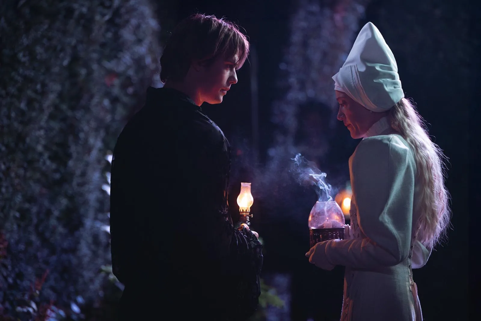 In Migal Bavel, women are forbidden to write but permitted to tell stories, and that disparity is directly sewn into the silhouette. “I really wanted the women to feel restricted,” Coulthard says. “The caged corset on Cherry and the strict uniform of Hero, with the men reflecting a more free-spirited attire.” Authority, meanwhile, is rendered through exaggeration. “The ridiculousness of the Beaked Brothers in their clerical robes and beaks,” she adds, is “a commentary on the inherent patriarchal society and their subjugation of women.”