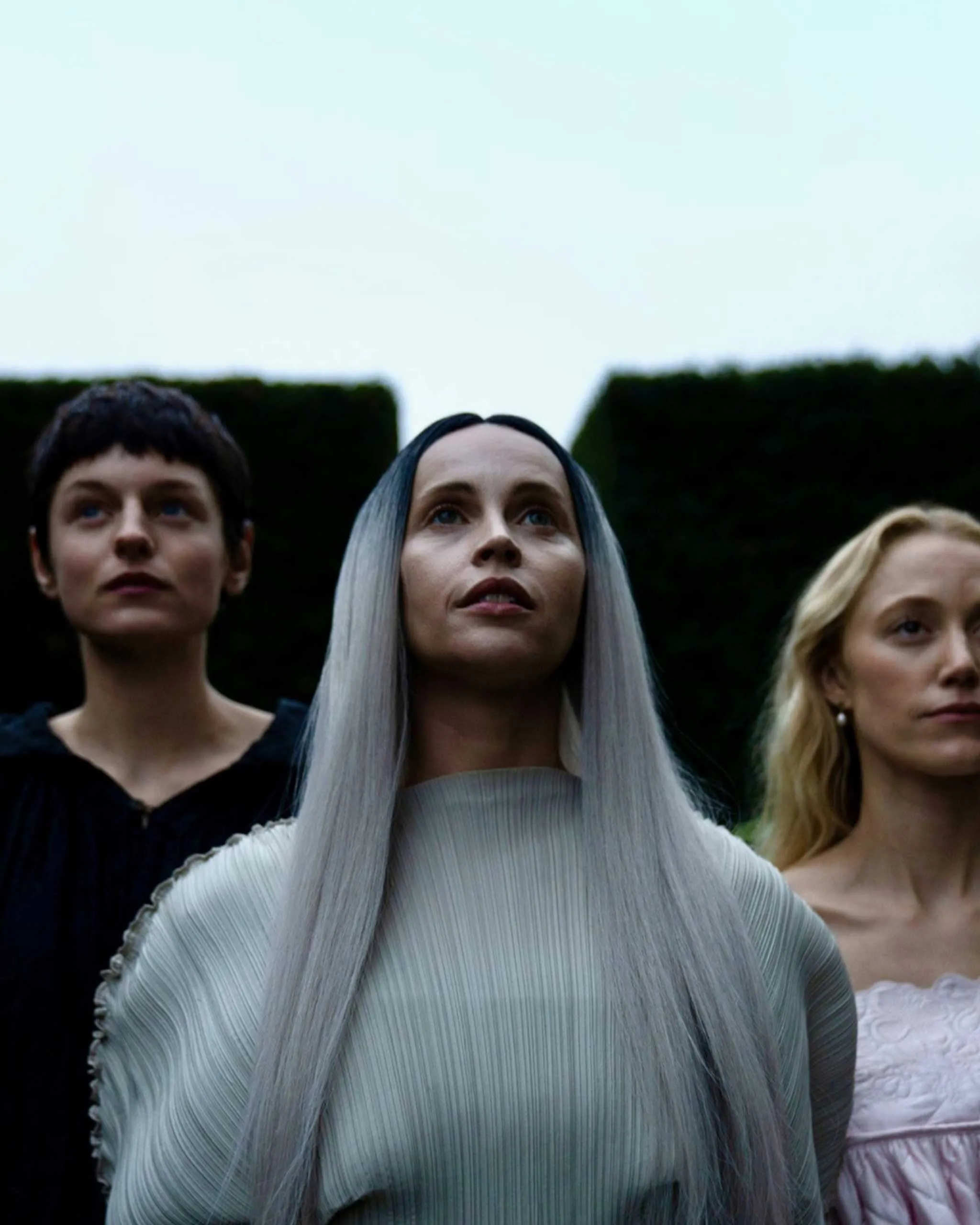 “We worked with fashion PR companies to facilitate some of the pieces for Cherry and Rosa, knowing we did not have the time or resources to make so many outfits,” Coulthard explains. Maika Monroe wore loaned Cecilie Bahnsen pieces, Elie Saab provided Charli XCX’s wedding dress, and Felicity Jones’ Moon wears Issey Miyake from CLTHD, the London-based designer fashion rental platform founded by Coulthard herself.