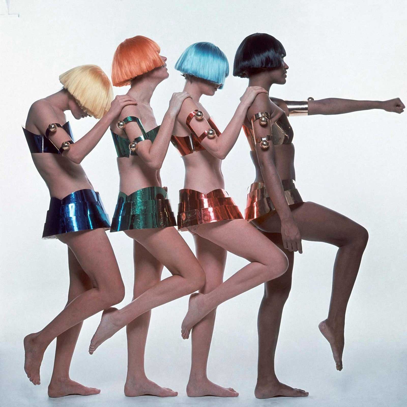 Though the United States went to the moon in 1969, it was years before that that space age fashions were launched. The era’s fascination with space exploration was expressed in a new style movement called Atomic and, in the fashion world, a crop of designers let their fancies take flight: André Courrèges, Paco Rabanne, and Pierre Cardin. Gleaming aluminum foil-esque silver vinyl decorated a collection of PVC moon girl fashions for “Courrèges’ Spring/Summer 1964 ‘Space Age’ collection, which also featured ‘astronaut’ hats and goggles and mid-calf-length boots”. In 1966, Cardin released a collection of pinafore dresses that were worn over slinky knots and turtlenecks.
