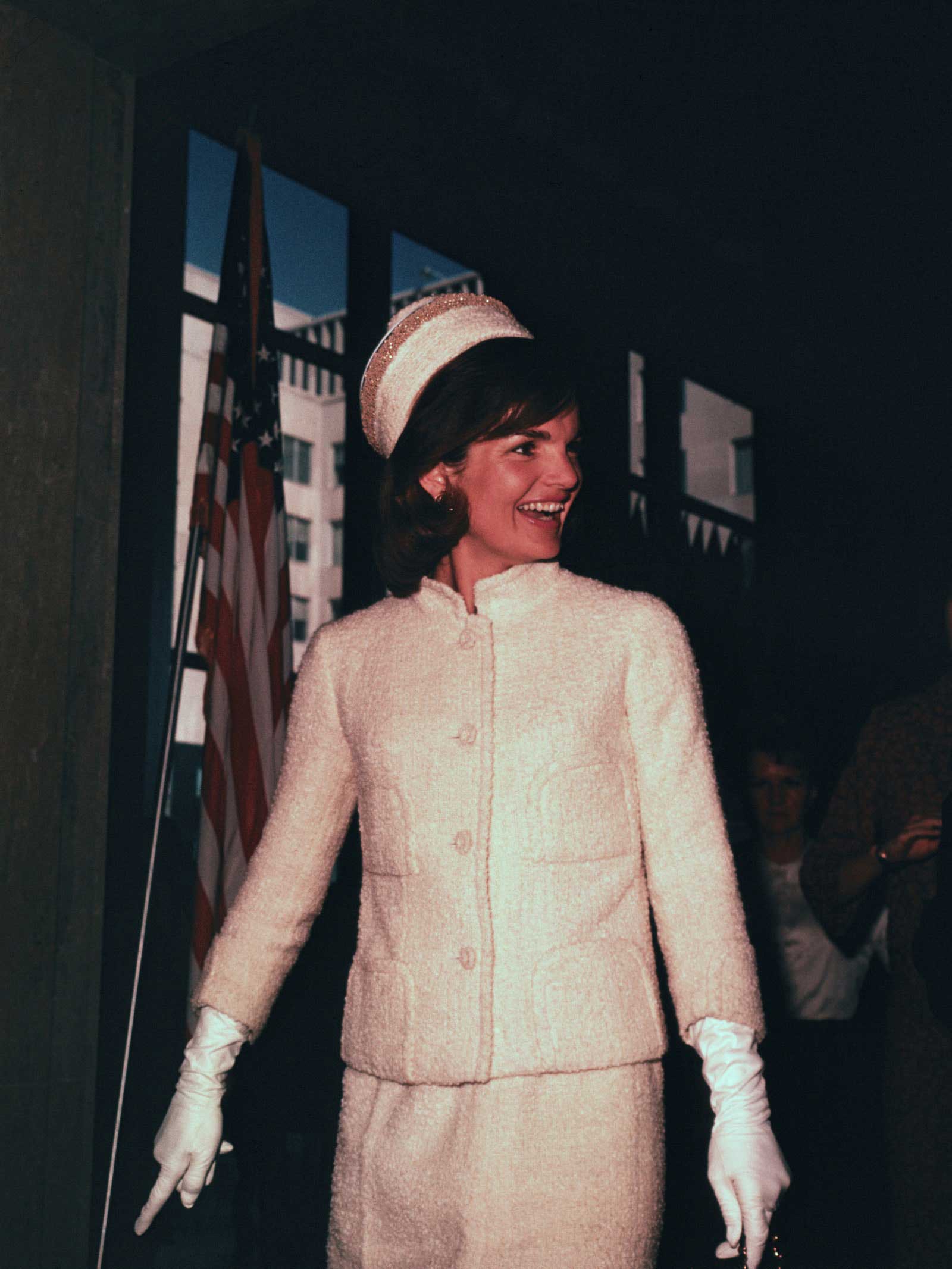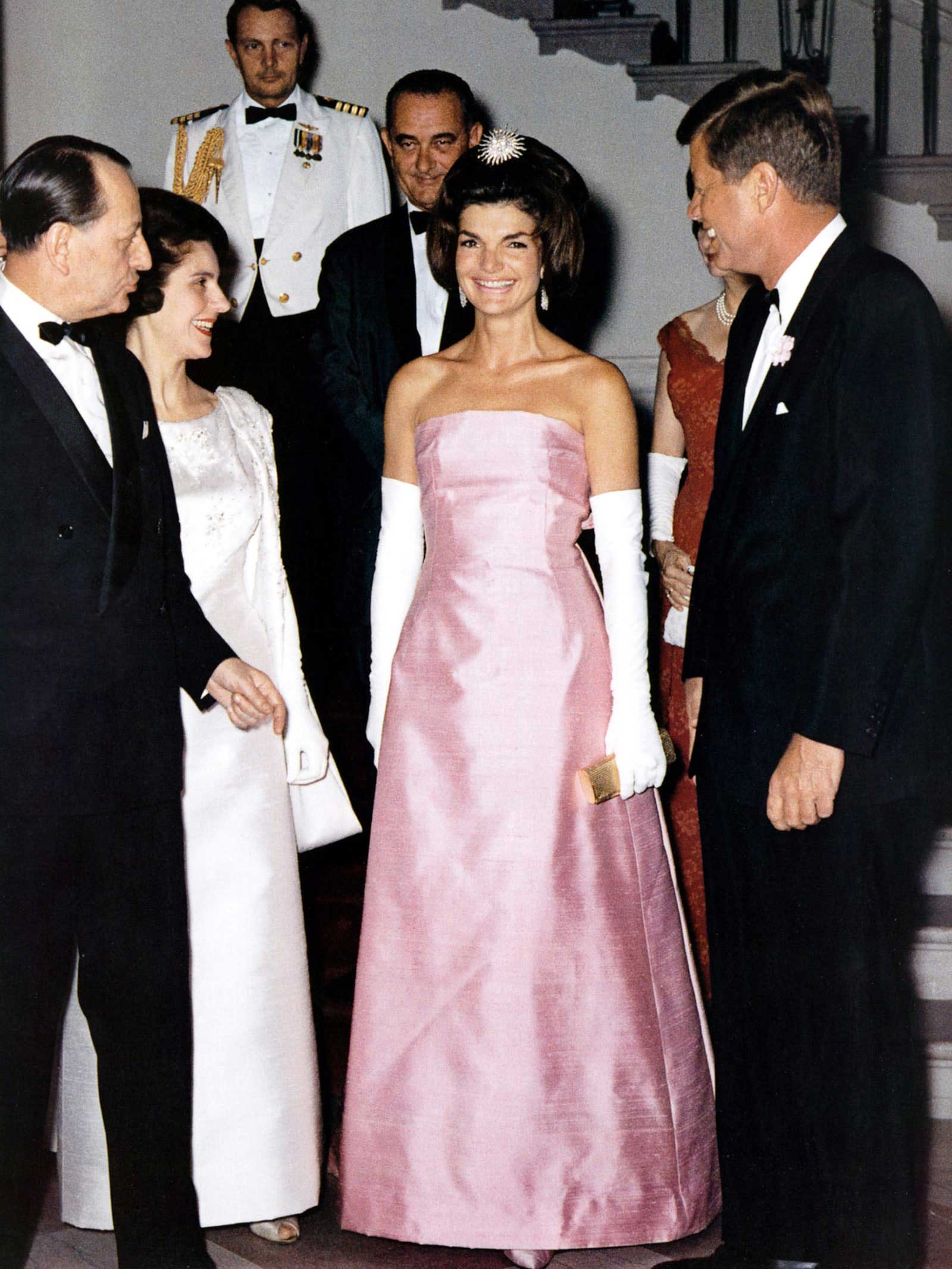 Skirt sets, trapeze silhouettes, and an overall primness were championed by designers like Patou, Saint Laurent, Pierre Cardin, and stateside by Norman Norell, Oscar de la Renta for Elizabeth Arden, Chez Ninon, and Oleg Cassini. The latter was appointed Kennedy’s personal designer.