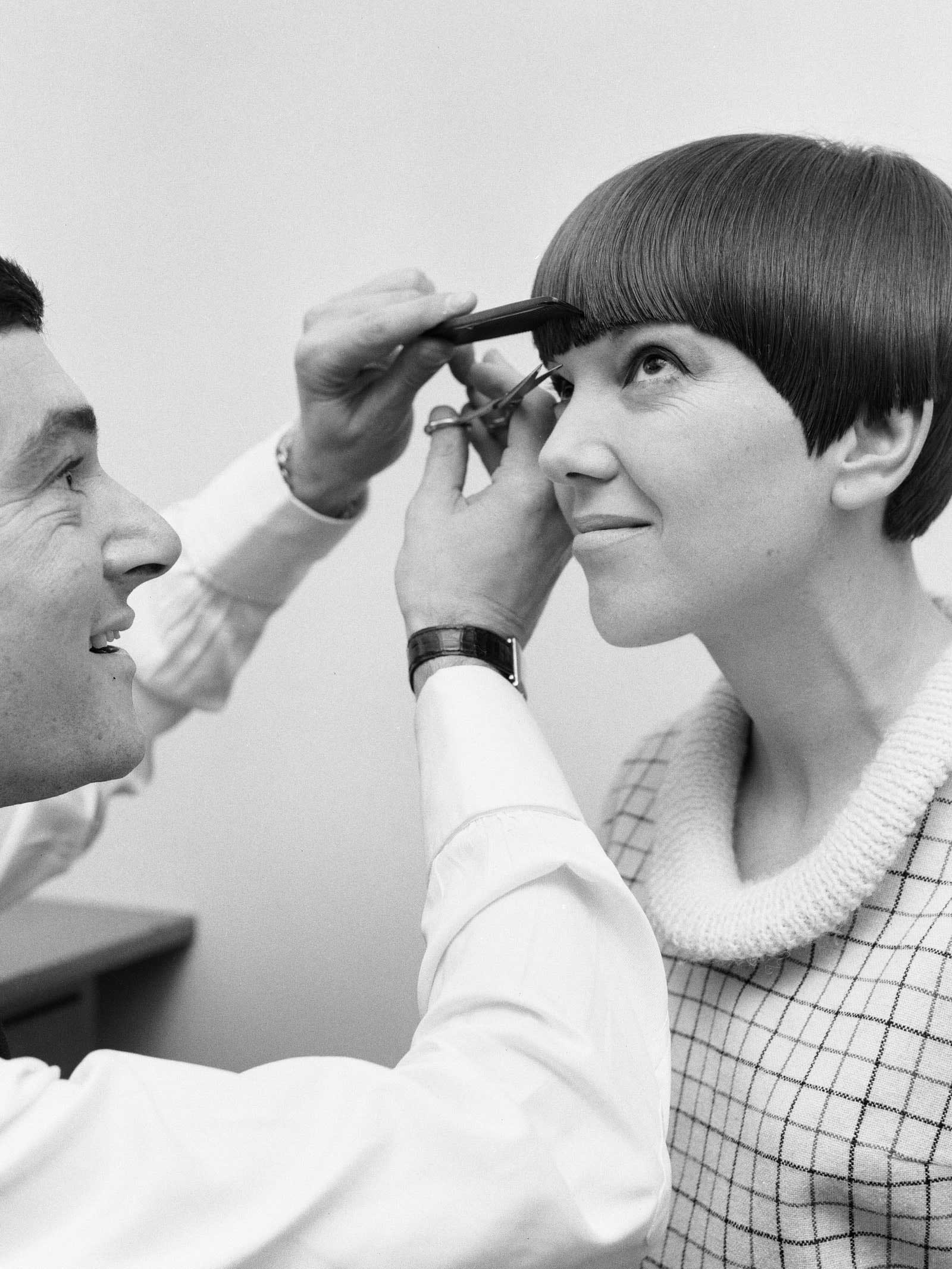 Mary Quant sported the look as did Mia Farrow whose pixie was courtesy of Sassoon as well. If not cropped like a bowl, women wore youthful bangs—see Jean Shrimpton—with lots of volume and a flip like a ski slope and the ends.