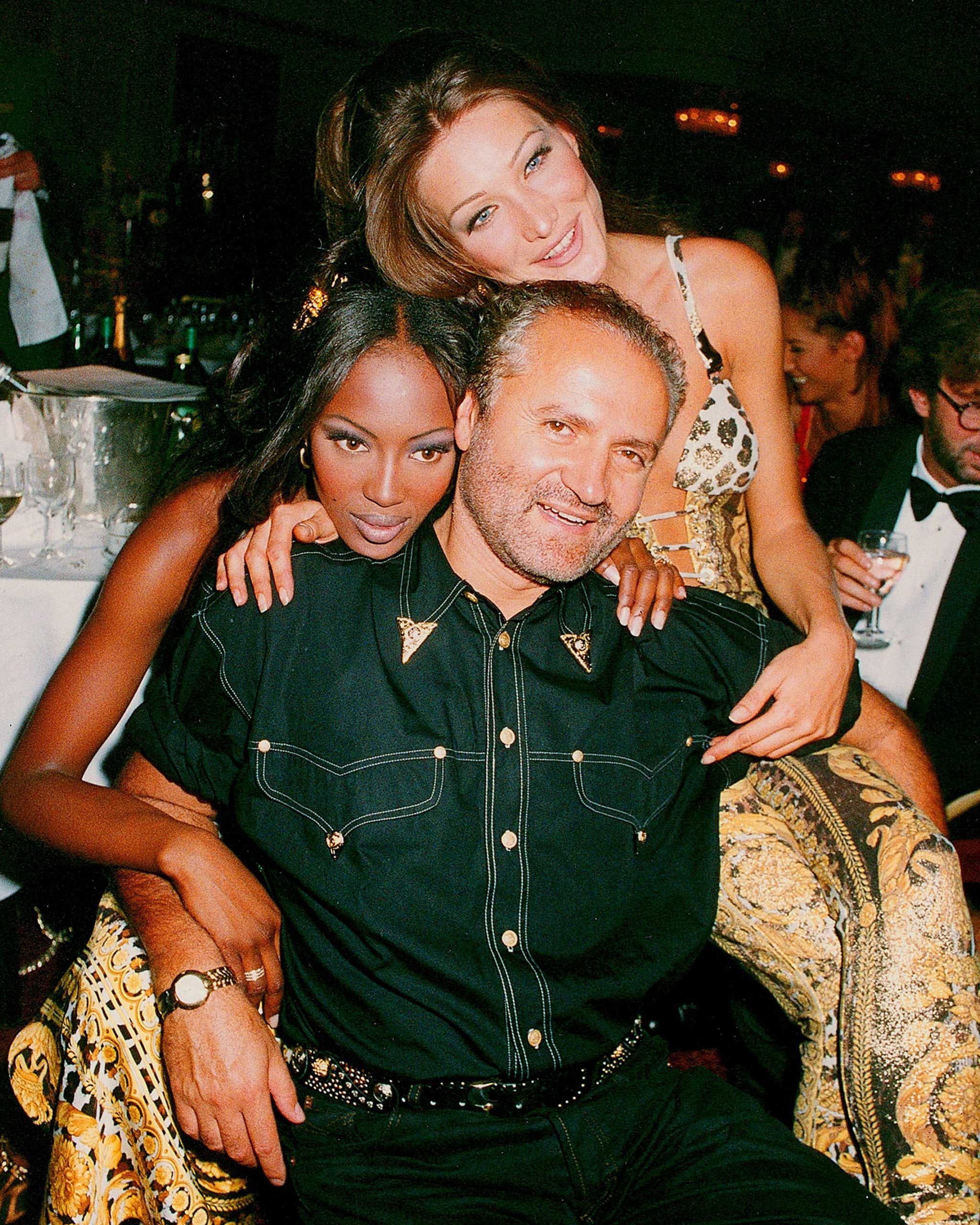 Models Carla Bruni and Naomi Campbell pose with designer Gianni Versace at The Rhythm of Life Fashion Ball, 1992 Dave M. Benett/Getty Images