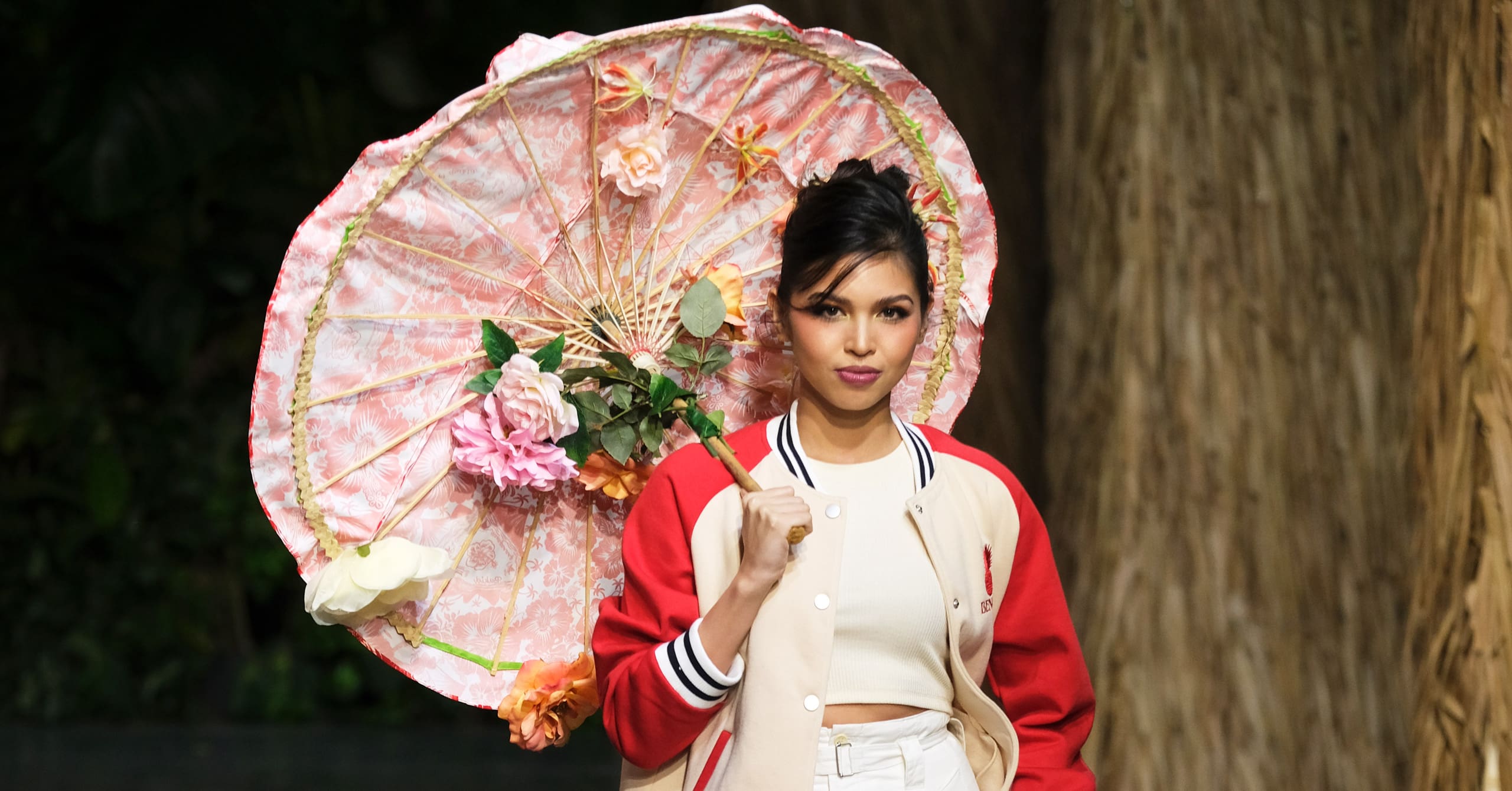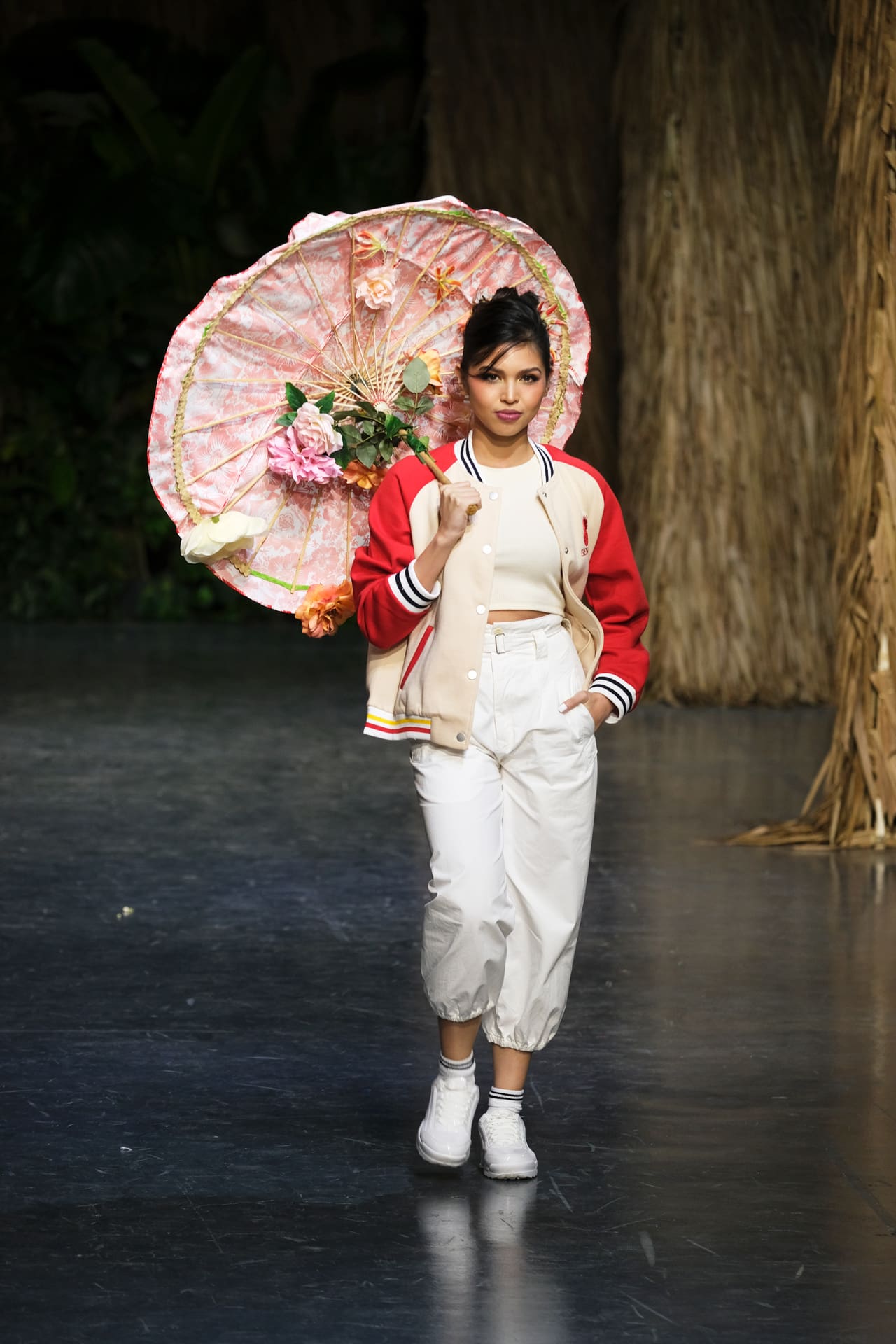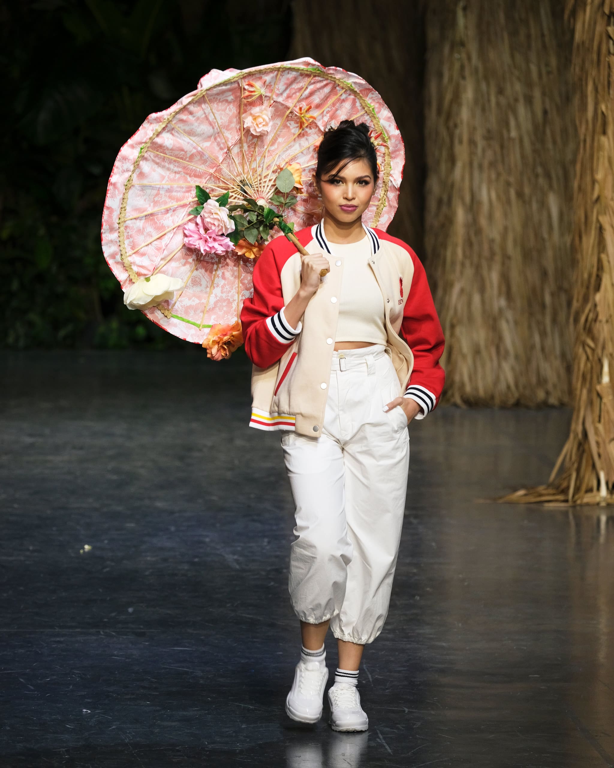 Actor Maine Mendoza leads the celebration of Lesley Mobo’s Masaganang Bukid collection. The tropical terno-infused capsule was truly a fiesta paying homage to the Philippines’ abundant rural life and our Filipino farmers. Wearing a varsity jacket paired with white trousers and an umbrella embellished with floral appliqués, Mendoza reflects the relaxed aesthetic Mobo champions throughout his collection.
