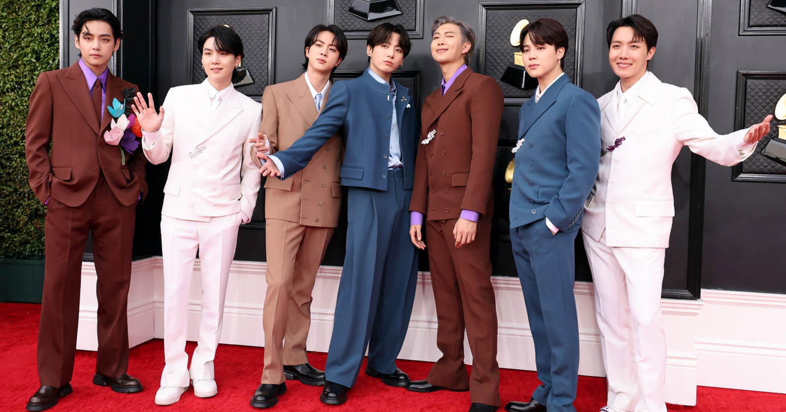 Before wooing the world and receiving a standing ovation for their performance at the 64th annual Grammys, BTS dazzled on the red carpet in head-to-toe Louis Vuitton. Member Jungkook posed in a yale blue set with a cropped band-collar jacket, baggy pants, and chunky black loafers.