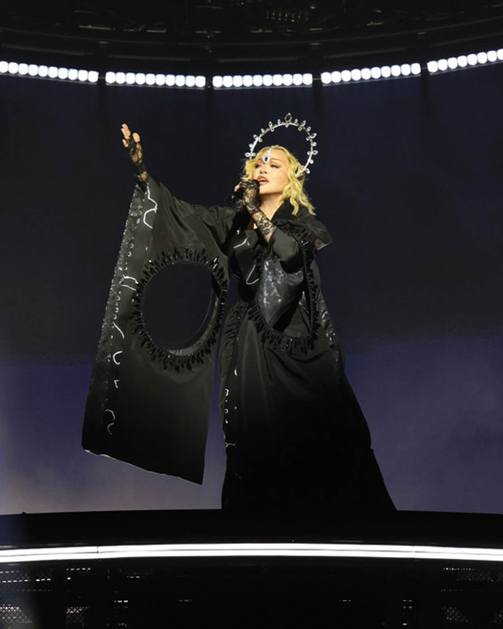 Act one opens with her singles such as “Burning Up” and “Everybody.” For the latter track, Madonna sports a punky tailcoat by Findikoglu, inspired by an archival blazer that the singer wore for a performance in Japan back in the ’80s. “It was a men’s coat that she got from a vintage store,” says Yohannes. “[For the new one,] we tricked it out, and added memorabilia and pins from the ’80s onto it. It was very much an ode to New York in the ’80s.”