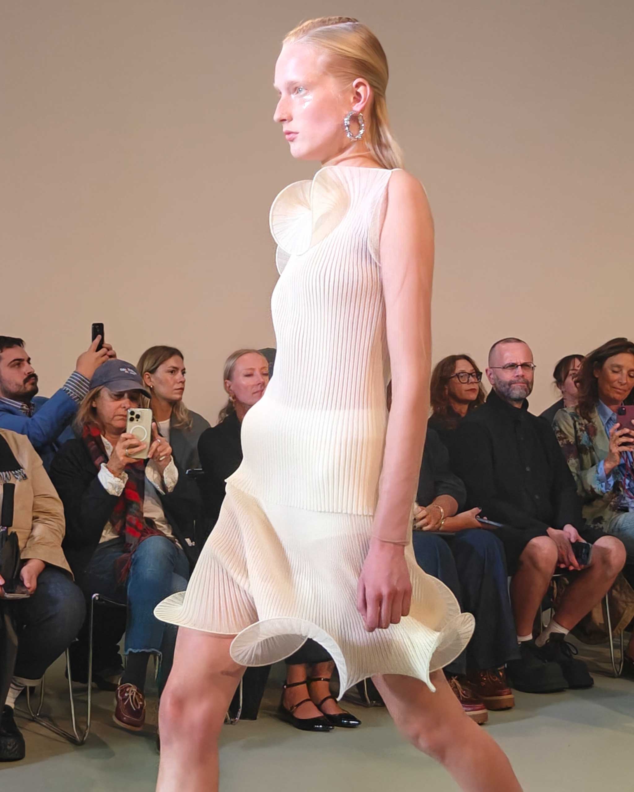 At Del Core, sheer, utilitarian layers, swirl-hemmed knits, and crushed silk goddess dresses set the tone for their spring 2025 collection. The show opened with a series of billowing, oversized white organza trench coats and layered separates. As the collection evolved, more structured pieces emerged: tailored pantsuits with a relaxed fit, featuring tapered trousers, alongside cropped, fitted leather jackets paired with shorts.