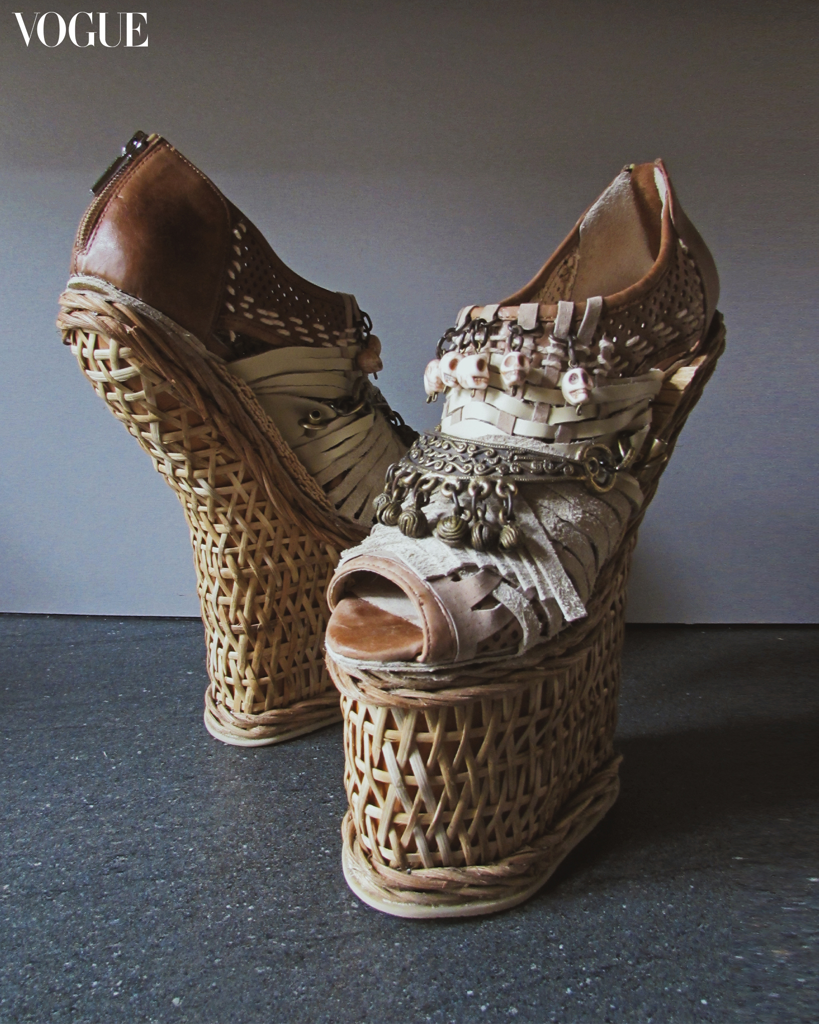 The art of woodcarving is most evidently on display in the Akbay shoes Tesoro has crafted for Leucitic Observations. The high-platform soles are a carved, solid chunk of mahogany wood wrapped in a criss-crossed weave of rattan and bamboo.