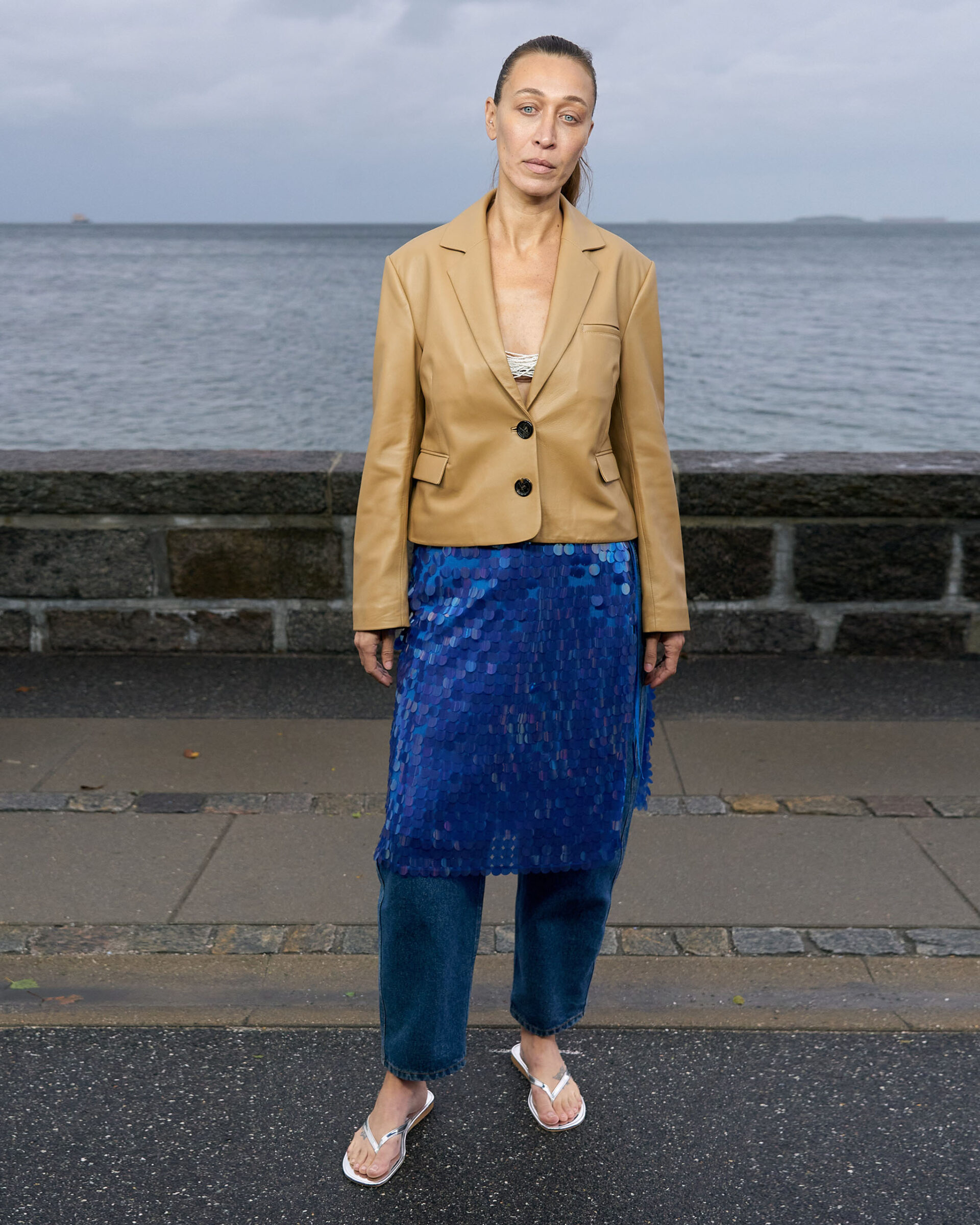 Wearing a macramé bra and cropped beige jacket, teamed with a blue sequined skirt over jeans and flip flops, Alana‘s look reflected the eclectic approach to dressing that’s been seen on the Scandi fashion set in recent seasons. In fact, one could easily imagine several of the Saks Potts’s looks being worn by the model’s younger sisters (both fans of the brand), including the striped polo tops and pair of jorts.
