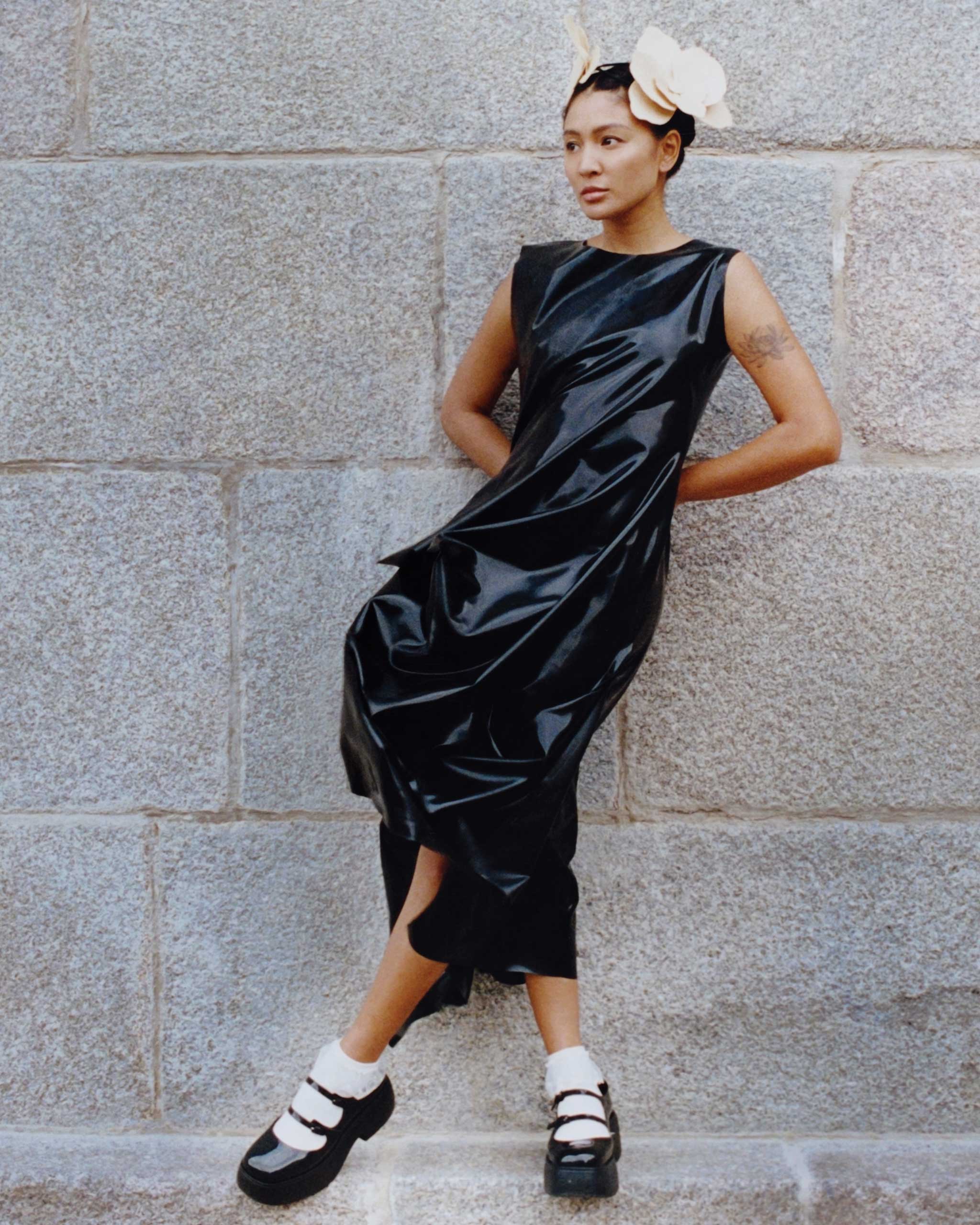 By the willow trees and flowing river, Lustre goes from wearing flowing black tulle to 3D-draped latex, a range of of ensembles that reflects her growth. “Nadine [wearing Dulce’s collection] delivers a poetic message of movement and progression, of maturity and evolution,” says fashion director Pam Quiñones. “Two formidable Filipino women coming together in a story that’s lensed by another Filipina is a celebration of the power of the dvine feminine, something that’s front and center in our March issue.”