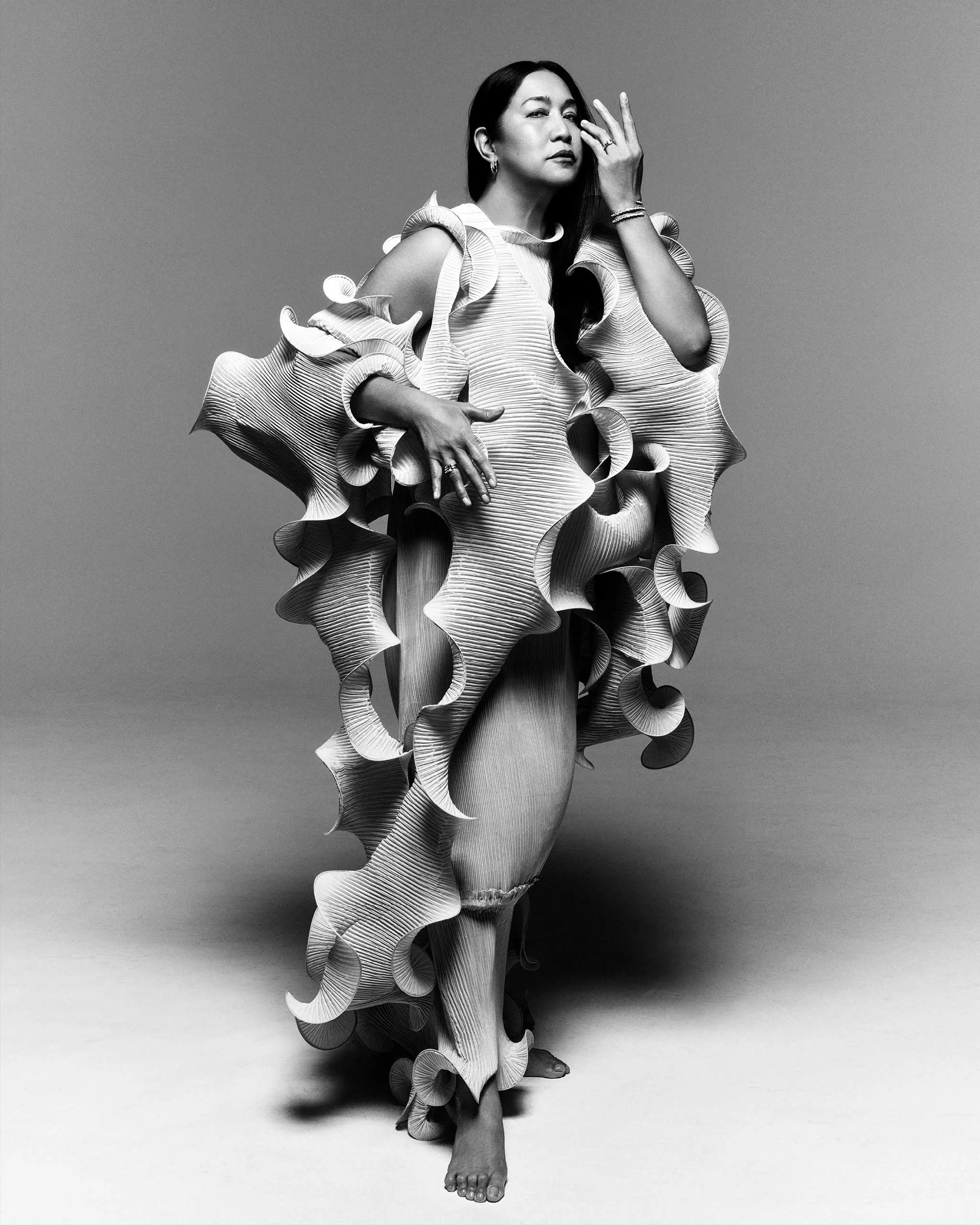 For Edley, curating the wardrobe was about timelessness and intentionality, with designers such as Schiaparelli, Marc Jacobs, and Christian Siriano. “I wanted to create timeless, sculptural, portrait-style images, so I didn’t want anything trendy,” he explained. “I chose mostly black and neutral pieces, and I wanted to take the opportunity to include some Filipino designers who were new to me, to help create richness and diversity for this shoot.”
