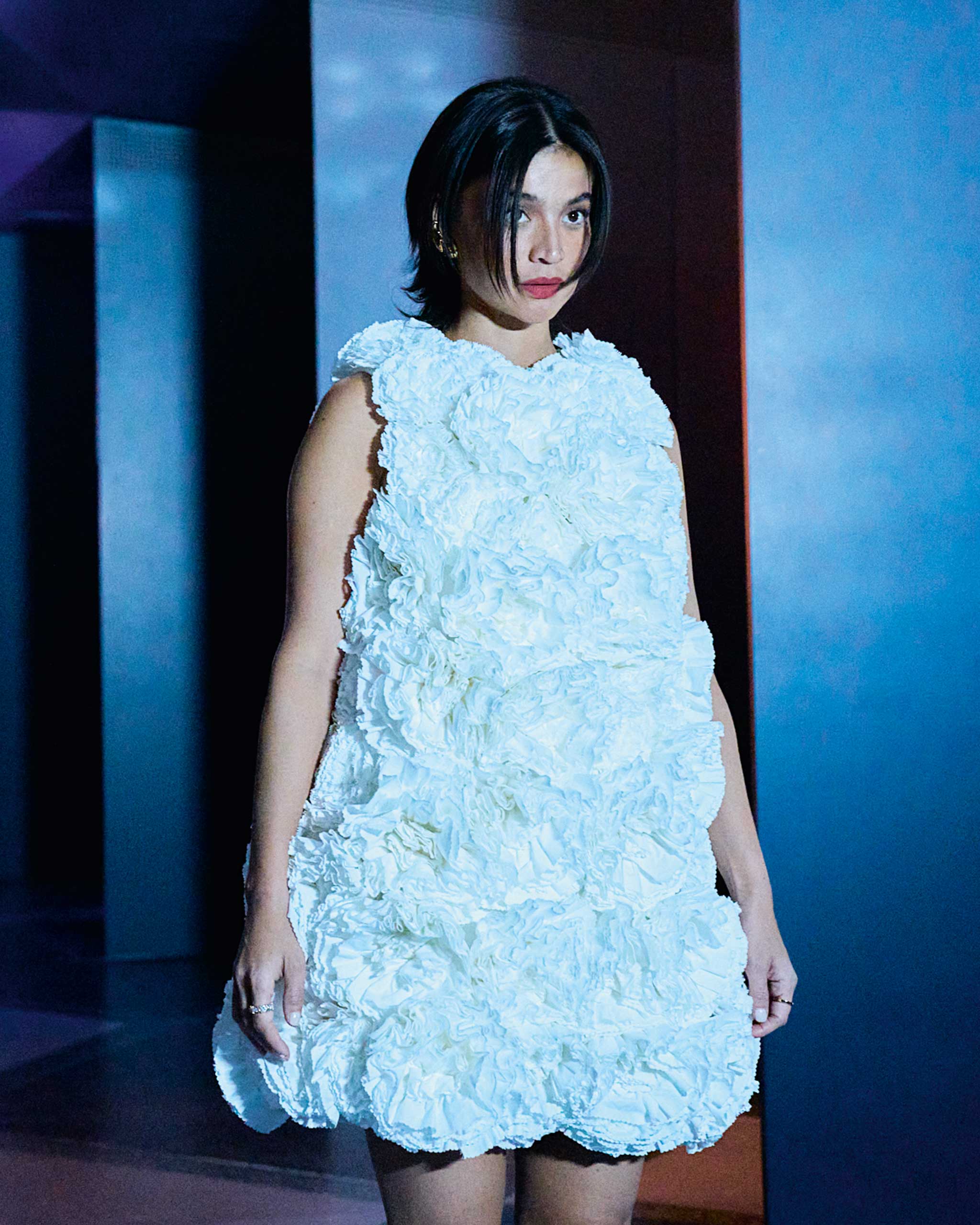 SHUSHU/TONG dress, AMINA MUADDI shoes, and TIFFANY & CO. earrings and rings. Photographed by Regine David for the August 2024 Issue of Vogue Philippines