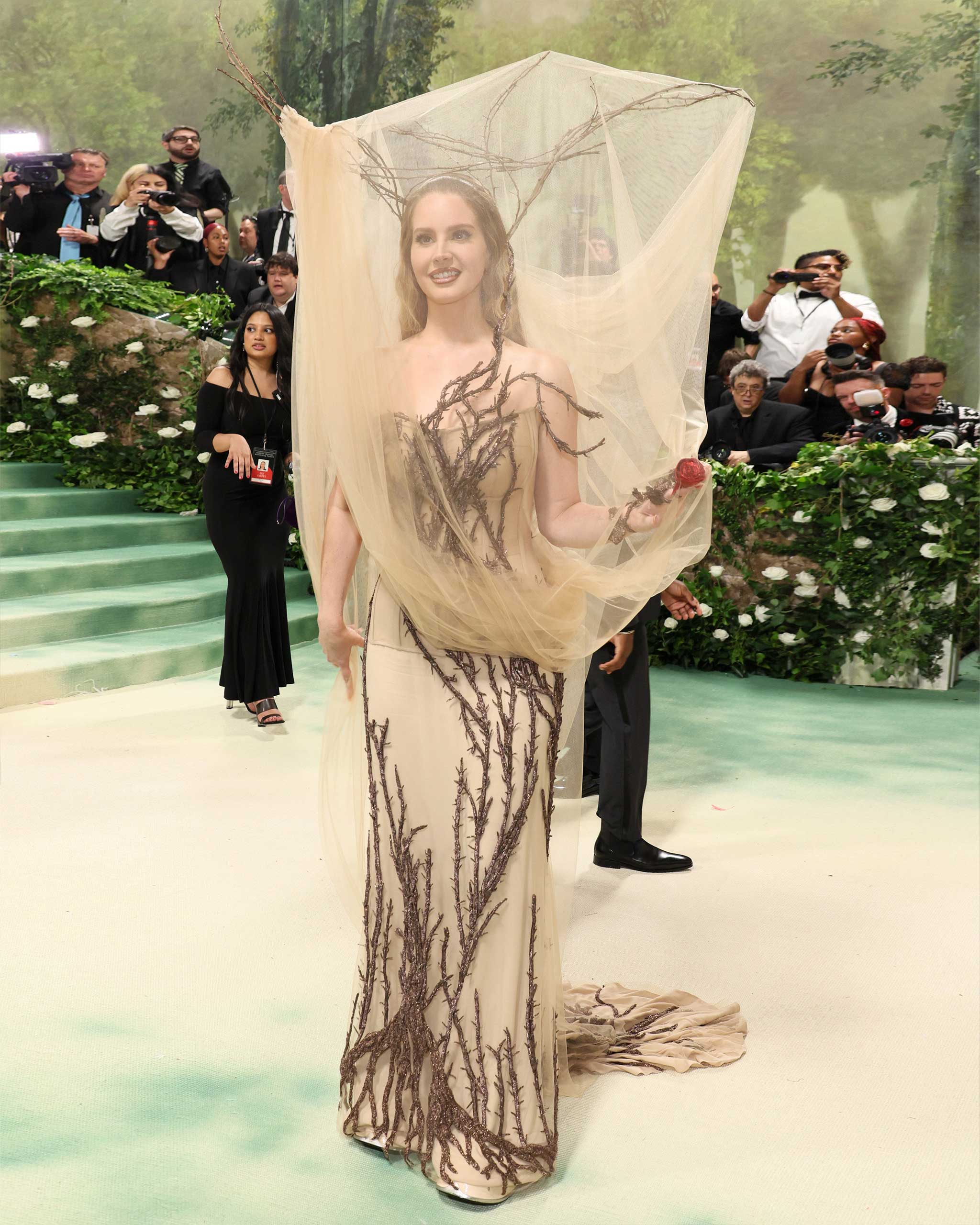 This evening marks Del Rey’s third time attending the Met Gala. In 2018, for the “Heavenly Bodies” theme, the singer delivered one of the night’s best fashion moments in a custom Gucci look, hitting the carpet alongside Jaret Leto. The design featured a cream dress with gold accents, including a sacred heart chest plate (pierced with tiny daggers) and an ombré blue headpiece with wings. Back in 2012, Del Rey arrived to the gala wearing a sleek Altuzarra look; Her metallic silver gown, complete with a sweetheart neckline, came with a dramatic black cape. Tonight, in her nature-focused look, the singer has wowed us once again.
