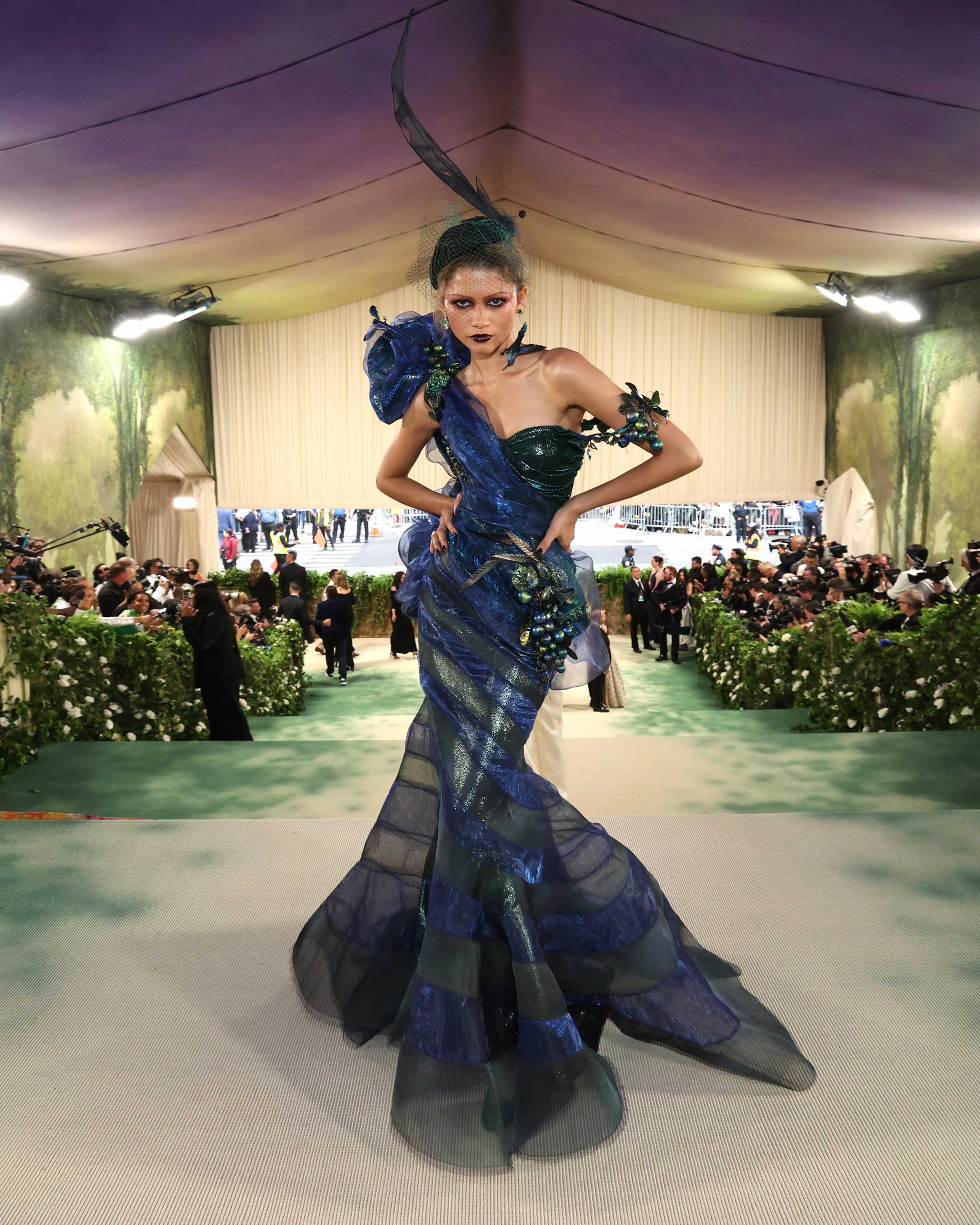 For her first walk up the Met steps, Zendaya wore an ocean-blue gown by Maison Margiela’s John Galliano that included a matching dramatic headpiece. It was a fitting choice for this year’s “Garden of Time” dress code—which encouraged guests to slip into thematic fashions that paid tribute to the natural world. In her mounds of tulle and fabric, she was reminiscent of the ocean—and the look felt just as refreshing as a summer-day dip.