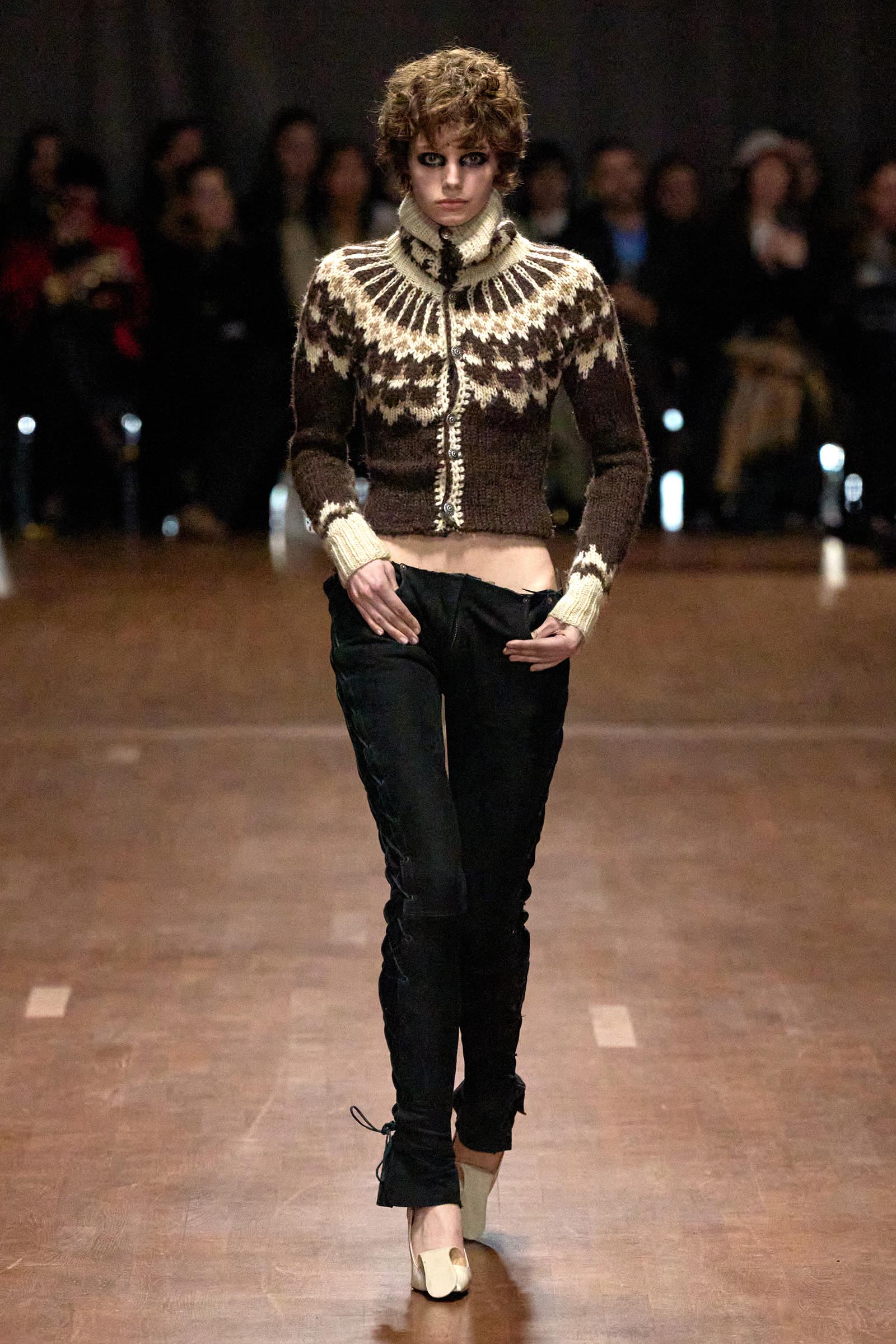 Ellen Hodakova Larsson made a striking return to the runway with her first major show since winning the prestigious LVMH Prize last year. Known for her distinct design language, she continues to push boundaries with upcycling deadstock and vintage materials. She presented a collection that fused twisted tailoring with workwear-inspired elements, featuring shrunken knitwear, belted waistbands repurposed as dresses and jackets, and sleek, lace-up leather ensembles.