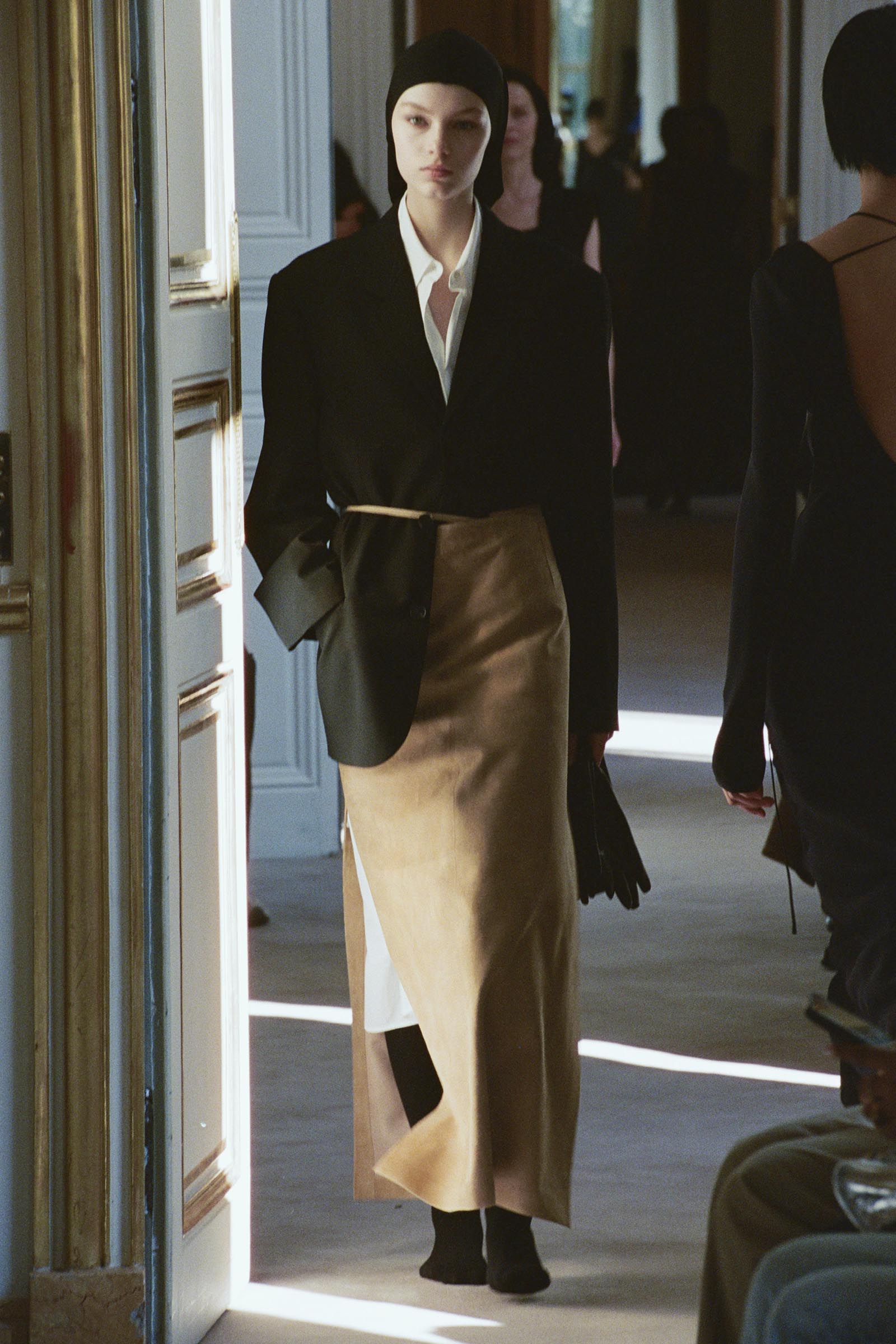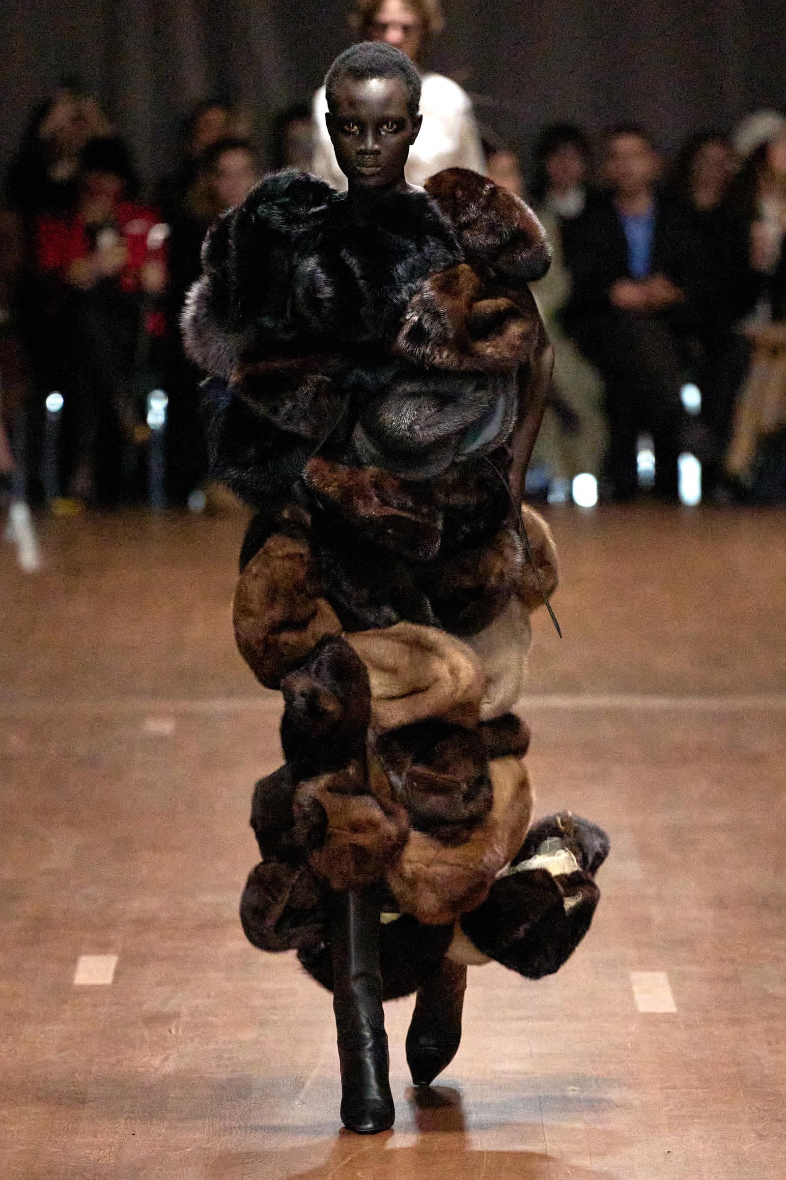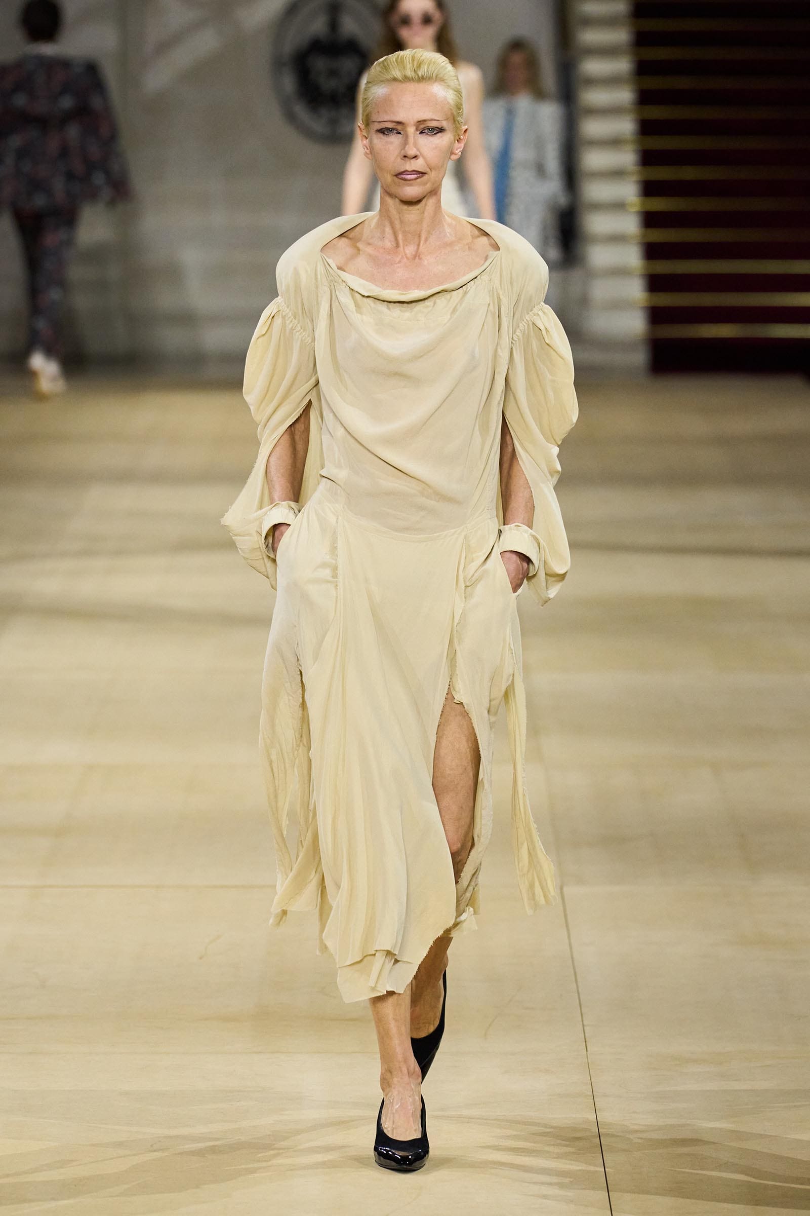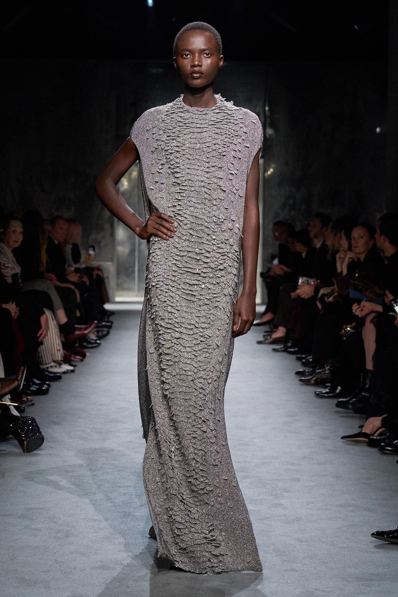 Designed by Pieter Mulier, this season’s collection draws inspiration from Dutch sculptor Mark Mander; his artwork punctuated the show space, emphasizing the agelessness of the body-conscious clothes that referenced different histories, periods, and places. Padded face-framing hoods, sculptural tubular tops, and multitiered fringe skirts celebrate and accentuate the natural curves of the female form, blending art with fashion in a striking exploration of structure and fluidity.