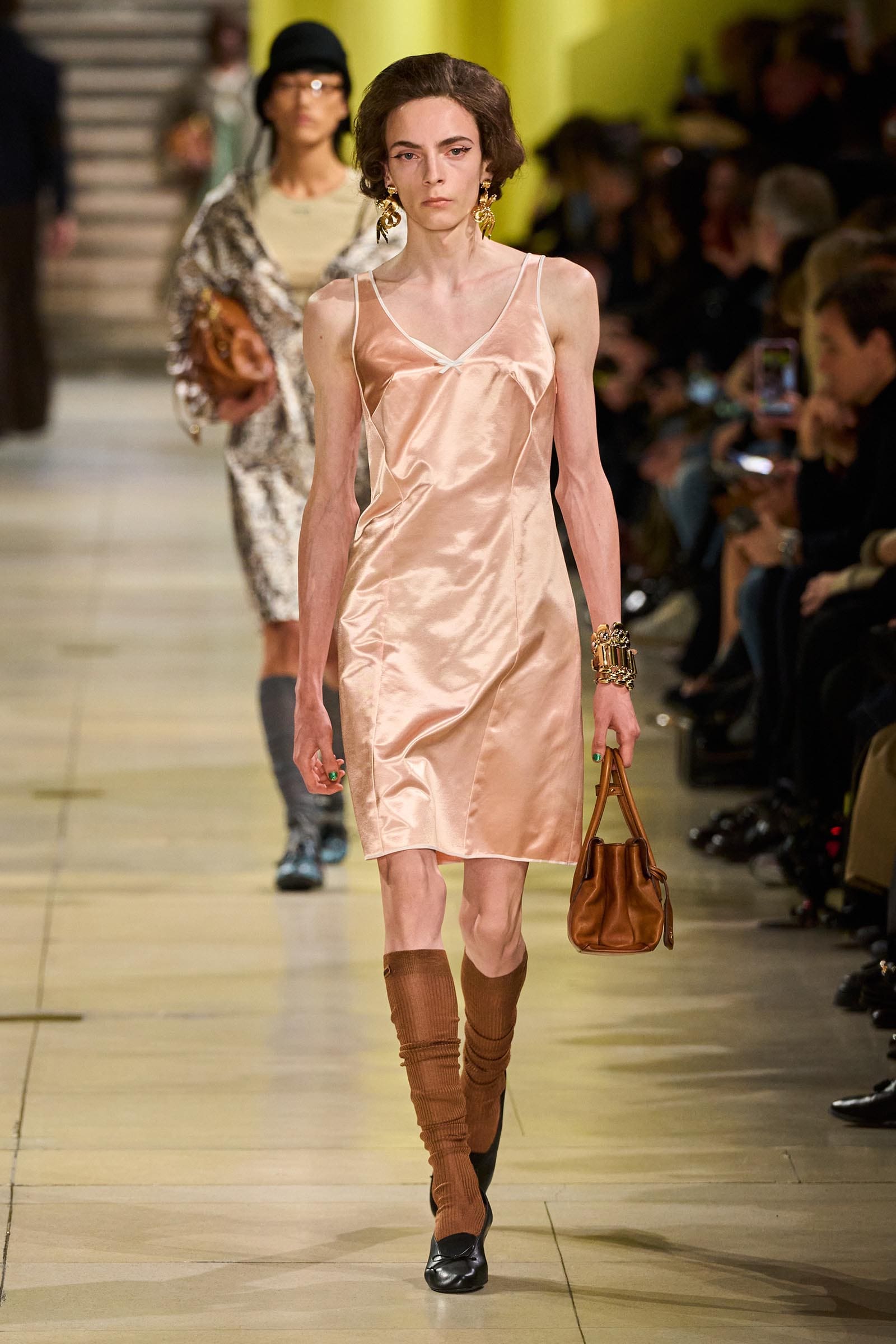 Mrs. Prada is reviving the bullet bra with her signature blend of playful womanhood and vintage femininity. The collection expertly balanced schoolgirl innocence with the refined grace of an educated woman, incorporating brooches, bedazzled socks, slouchy tweed suits, and cozy cardigans. As always, the runway featured a stellar lineup of A-listers, including Gigi Hadid, Lou Doillon, Raffey Cassidy, Laura Harrier, and Sarah Paulson.