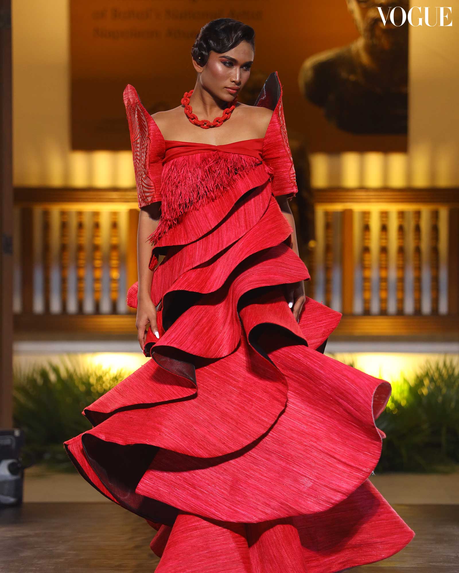 In a fashion show staged at the National Museum of the Philippines – Bohol, the textile took on flounced forms twisted and molded to the body, inspired by Filipiniana and contemporary silhouettes alike. Designers Christian Bustrillos, Christian Relator, EJ Relampagos, Noel Estopito Couture’s Noel Bombat Estopito and Christian Kent Panglinawan, and Fashion Institute of the Philippines CEO Shanon Pamaong present what is possible now, even if raffia as a clothing textile still lies in early stages of development. Within the collections, there is inspiration striking in terms of creativity, but also of functionality. Pamaong tells Vogue that he sees his pieces being worn separately; his kimona can even be paired with jeans for a casual day out, he laughs.