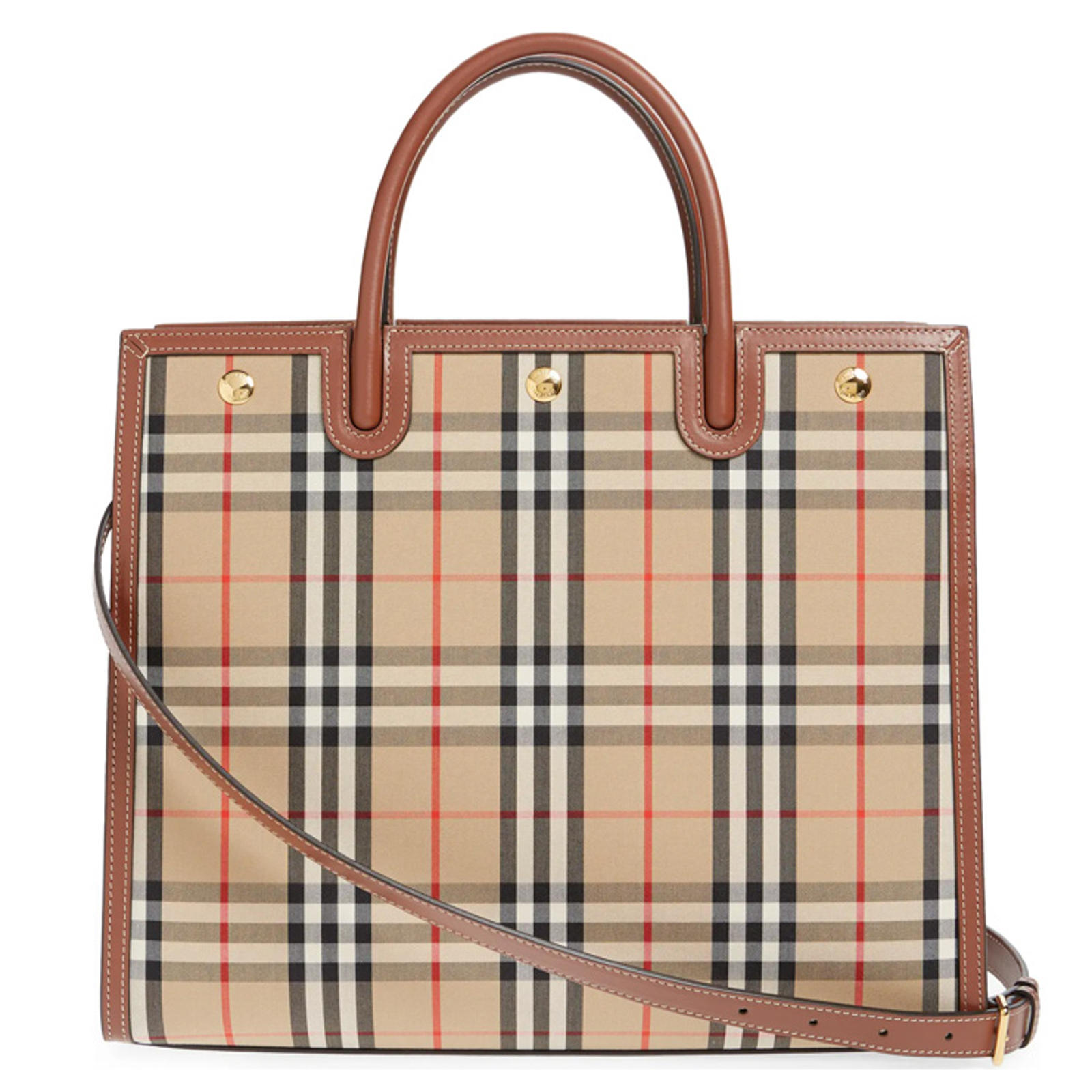 In the scene from the show’s Sunday premiere that has now gone viral, Tom (played by Matthew Macfayden) is seen critiquing Greg’s (played by Nicholas Braun) date, Bridget (played by Francesca Root-Dodson) for bringing a “ludicrously capacious” and “gargantuan” bag to Logan Roy’s (played by Brian Cox) birthday party. The bag in question was a Burberry Title vintage check two-handle bag.