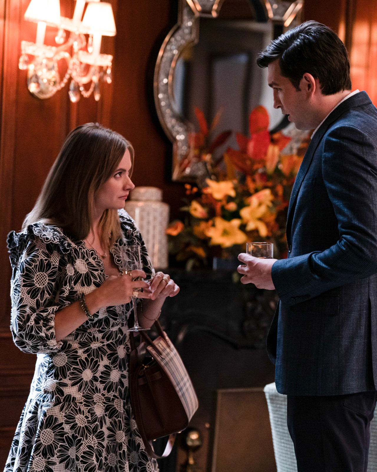 Bridget wore the bag over a Sandro black and white floral short dress in embroidered fabric with a ruffled collar, puff sleeves and a frilly skirt, and ankle-high black boots. Bridget also used the bag’s crossbody sling to carry the tote over her shoulder. At the London premiere of the show, creator Jesse Armstrong revealed the bag choice was based on an interview they had with a wealthy New York woman asking about the “most offensive bag a woman could bring to something like this.”