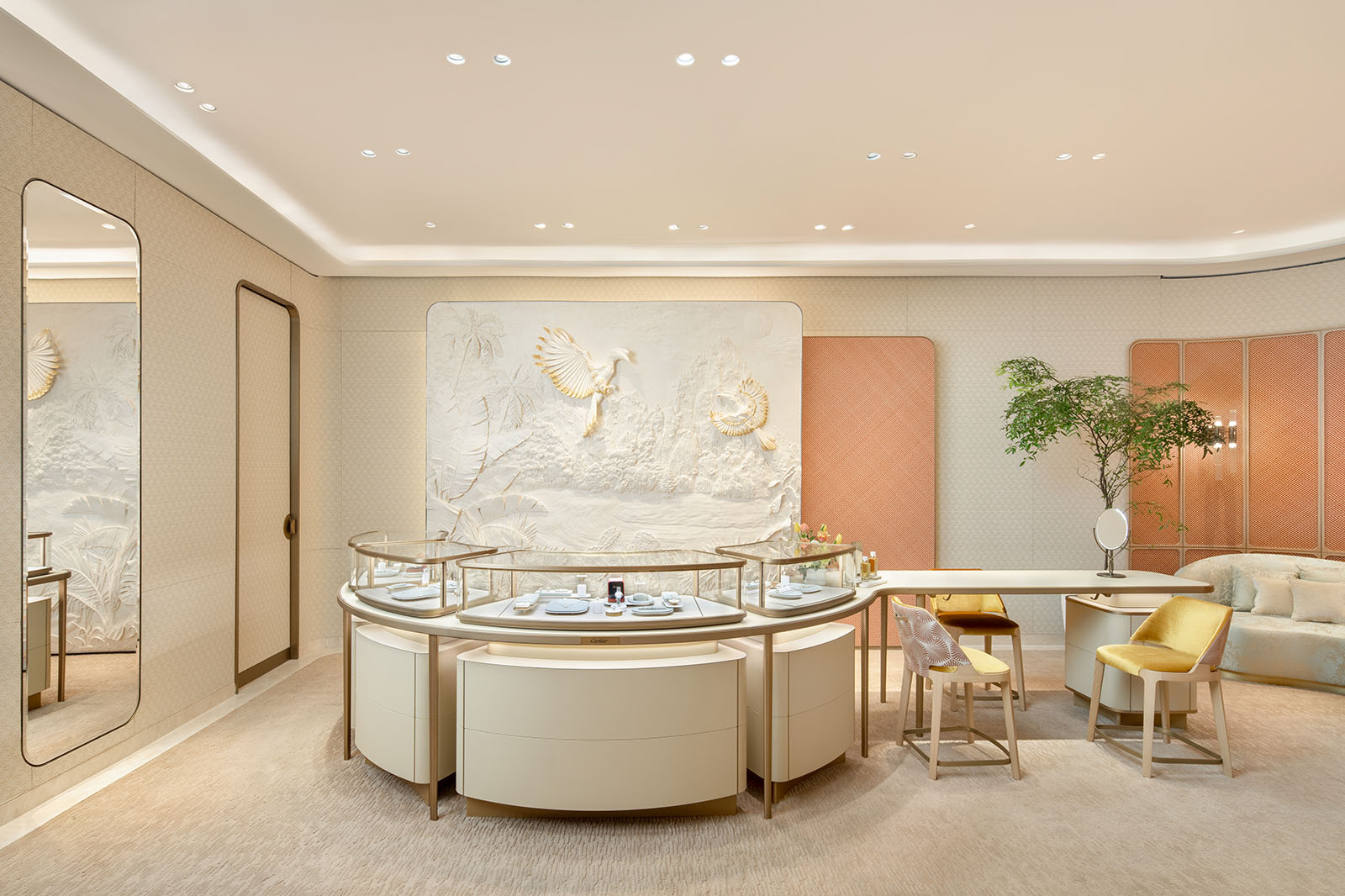 Lastly, there is the bridal space. Upon closer inspection the white bas relief reveals jagged cliffs and coconut trees framing a crescent beach, banana tree fronds dancing in the wind, the tide rushing while also slowly ebbing out, and two birds mid-flight with gold inserts from Del Boca. In the middle of a mating call, a romantic dance perhaps? It is quite intriguing. Beauty after all takes many forms—timeless jewelry, classic watches, a well-appointed interior of cross-cultural design to enjoy all of these in, and an experiential browsing and buying experience in which traditions of craft are in dialogue with architecture and heritage.