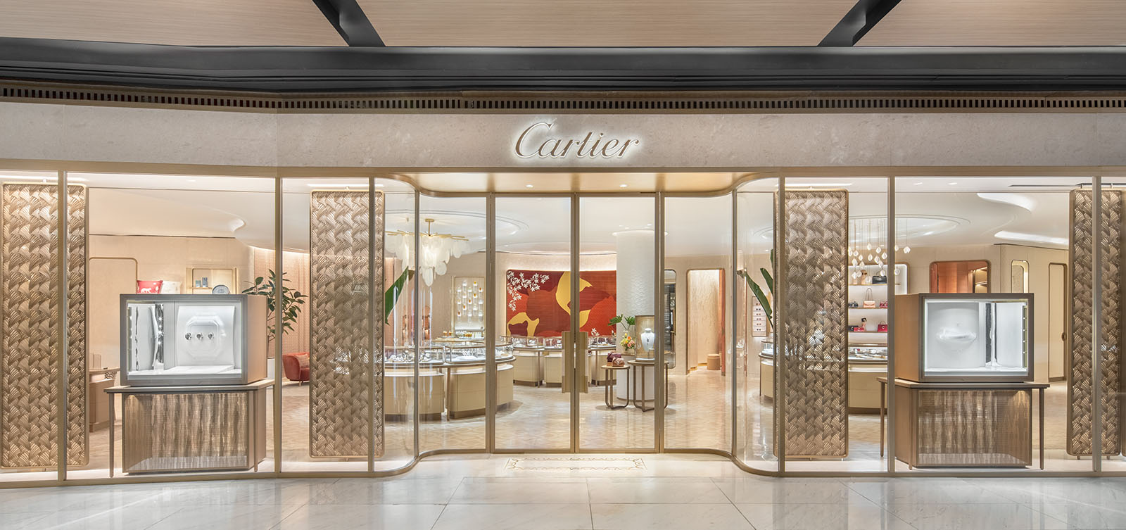 This design-led store was formed by Agence Moinard Betaille, an interior-architecture firm based in France that has been a collaborator of the Maison for over two decades. Known for their creative luxury aesthetic using sophisticated and contemporary lines, they’ve fused Filipino elements seamlessly in the showcase. Some discoveries to be made as you explore the store start with the vivid red wall that greets you as you walk in. Cartier’s illustrative emblem, the panther, is overlaid in a sort of shadow play depicting a pride at sunset, surrounded by blooms crafted to represent the national flower of the Philippines, the Sampaguita.