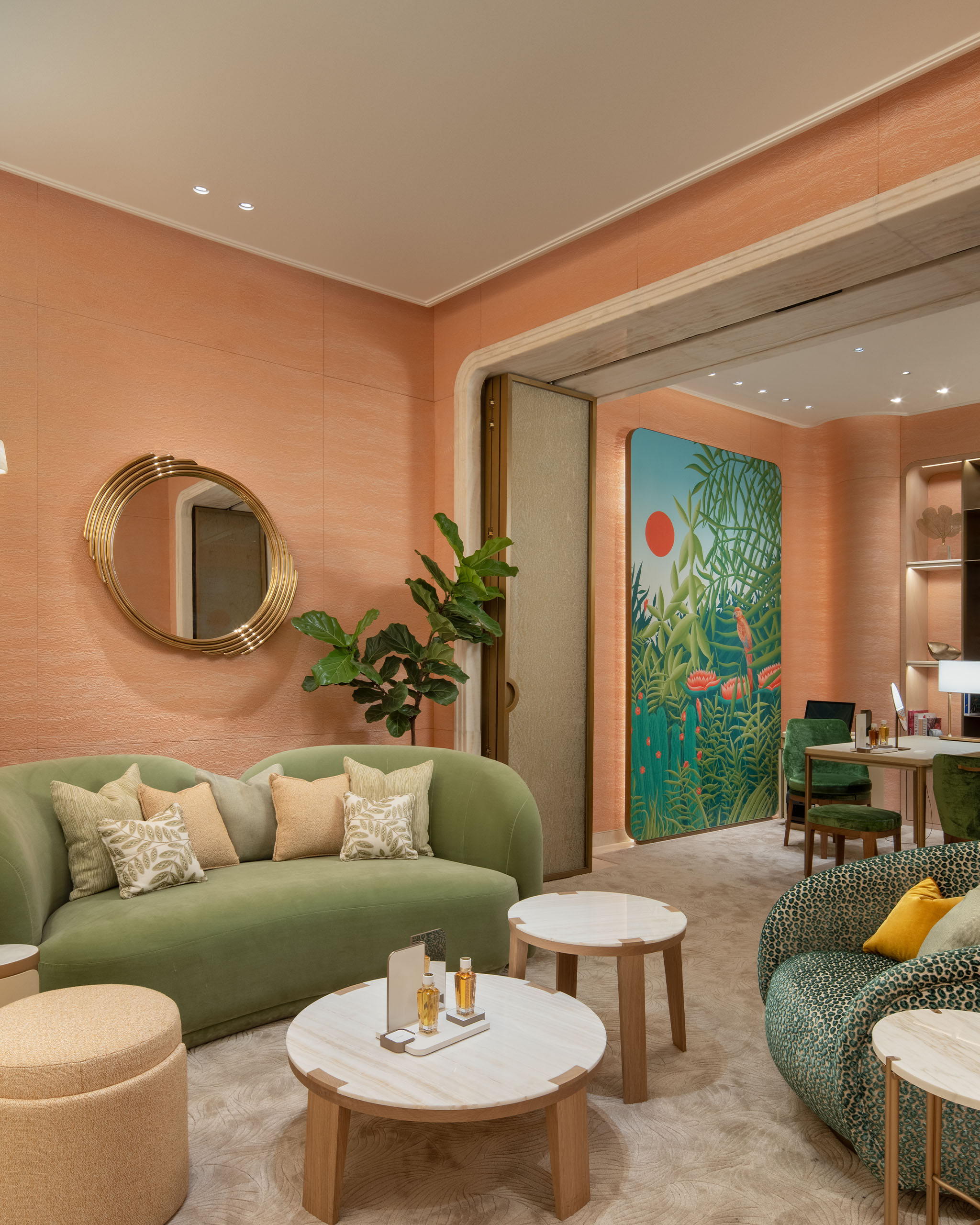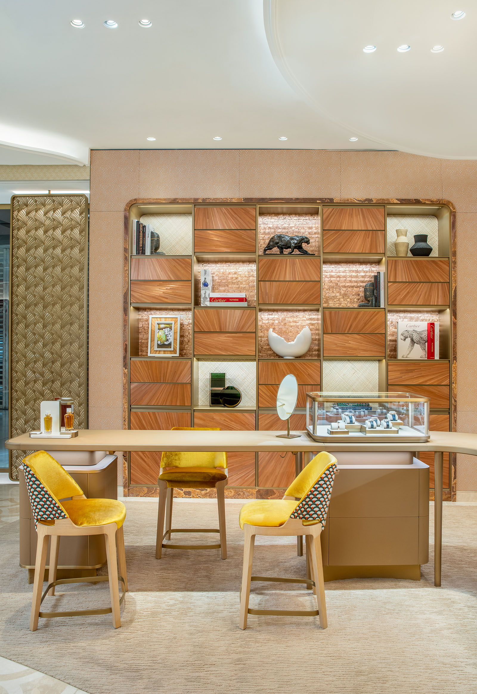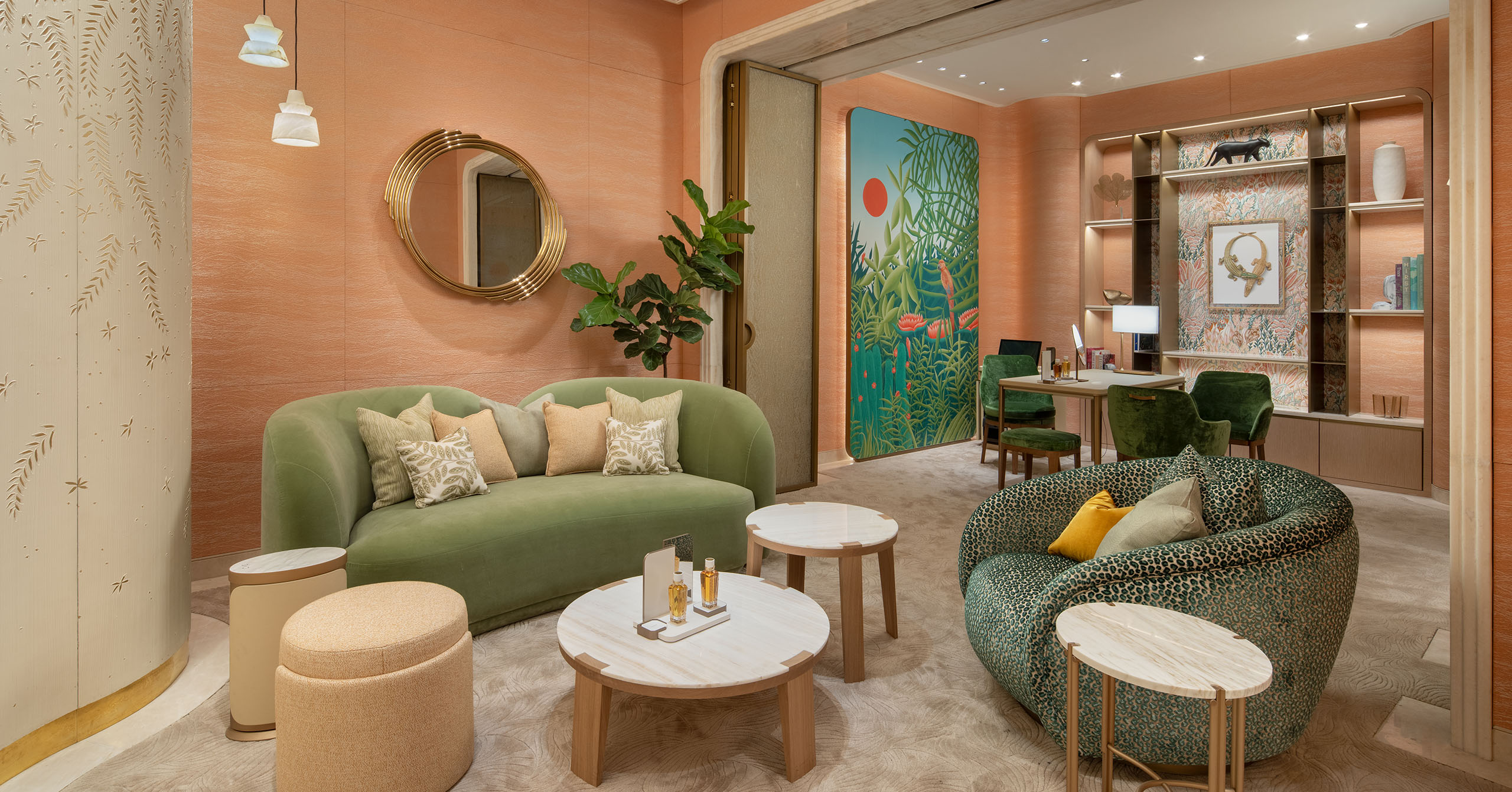 Of course, one comes into a Cartier store seeking answers to one’s heart’s yearnings. The configuration allows that emotional moment to be given space, in private. Take the VIP room for example, muted in soft blush and peaceful greens, velvety smooth curved armchairs ready to cocoon; on the wall, a tranquil scenery depicting the rich agriculture of the Philippines by De Gournay, a corner to luxuriate in undisturbed. An elegant oasis where every surface invites you to for a closer look, exactly what the pieces of Cartier call out for.