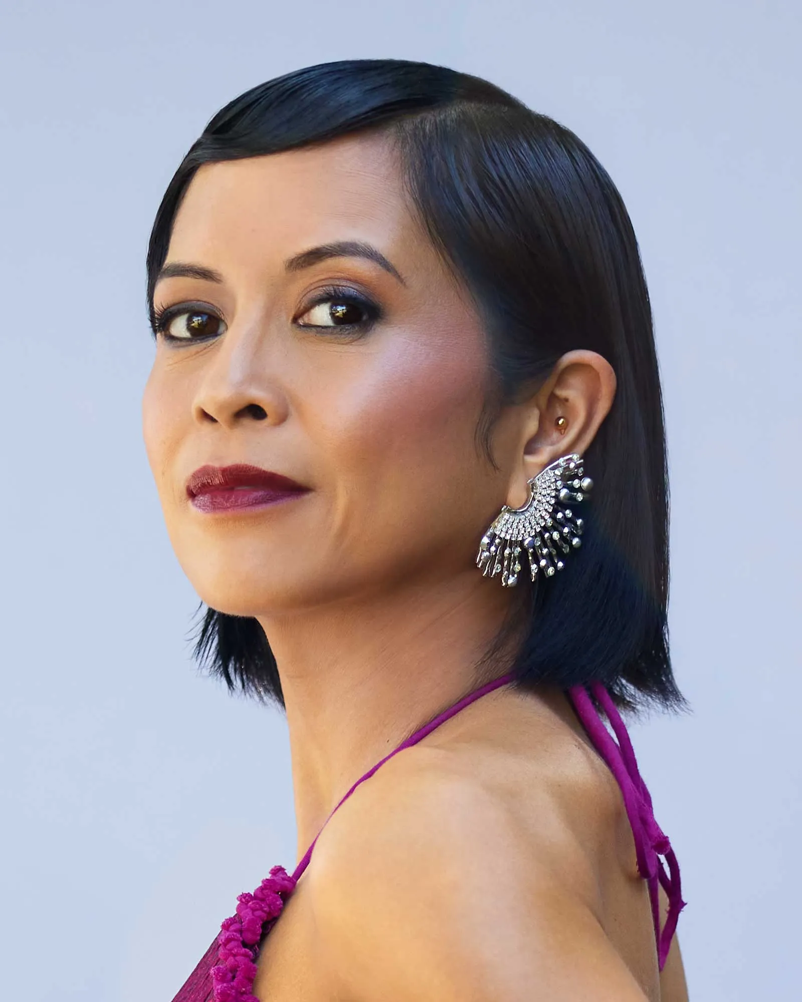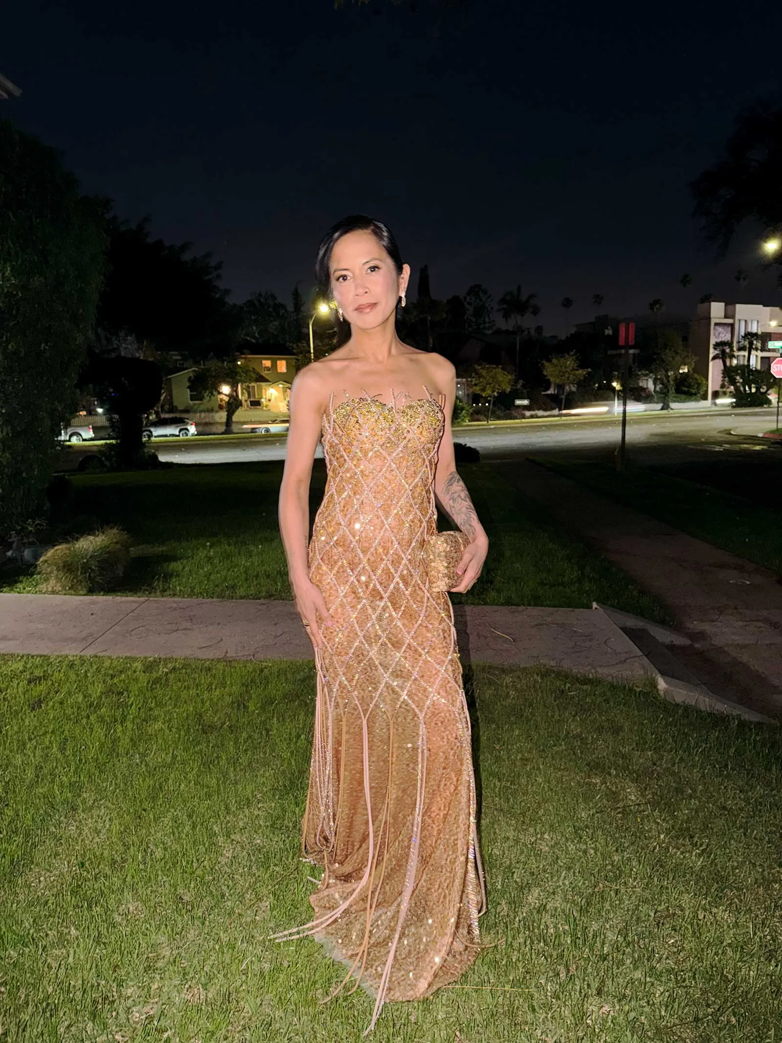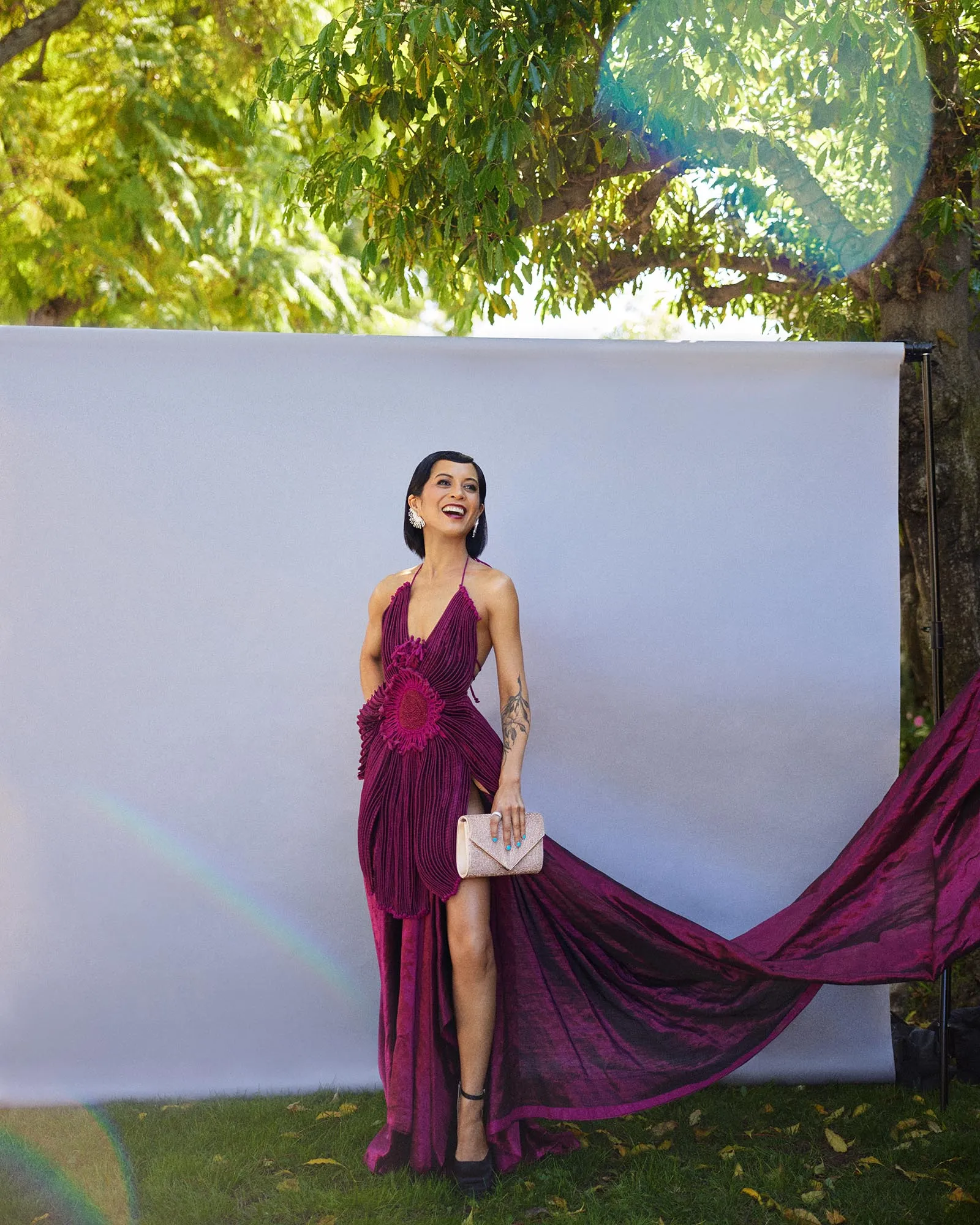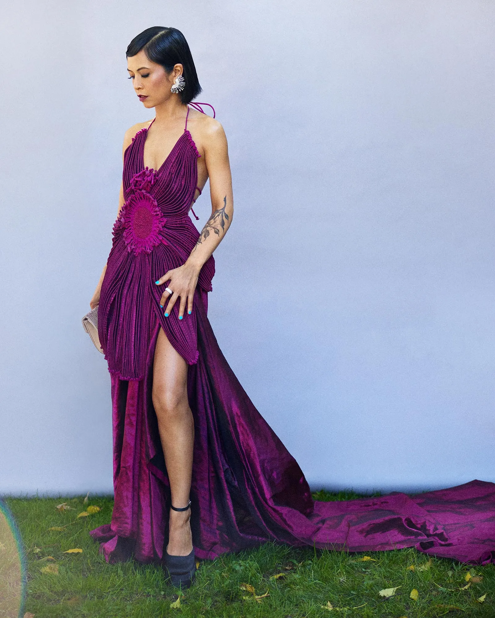 Amielynn Abellera: For the Actor Awards, I immediately fell in love with the Vaishali Couture gown, which we all lovingly agreed to call the “Angry Flower”. I love florals, as my daughter’s name is Sampaguita (the national flower of the Philippines). The gown’s color varied beautifully in different lighting and emitted varied shades of dark pink, red, and black. It exuded a bold, enigmatic energy, while still radiating a feminine playfulness. The gown also felt like an homage to the malong, a traditional hand-woven garment worn by men and women in Mindanao. I felt emboldened and so proud to wear a gown that not only carried strength and grace, but also radiated my heritage and ancestry.