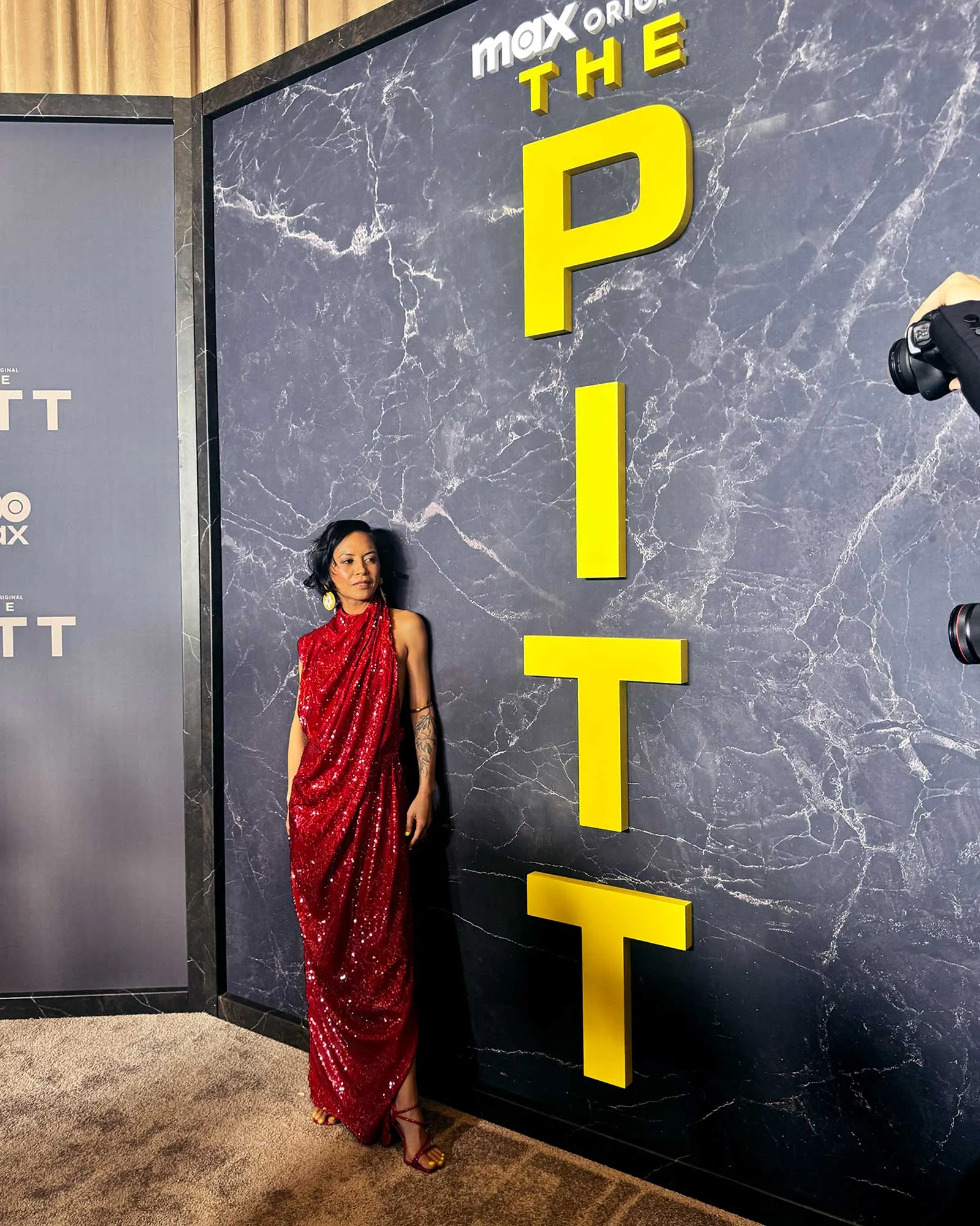 Amielynn Abellera: For the Pitt Season 2 Premiere, the beautiful red sequined gown was my first and favorite choice. Again, it is always important to me to have touches of my culture in the pieces I wear. This gown felt like a reimagination of the balabal, a Filipino cloak-like shawl, traditionally worn over the shoulders and upper body. Paired with ADIBA’s gold sampaguita earrings, the gown was effortless, regal, and a purposeful tribute to both Sky’s and my Filipino identity.