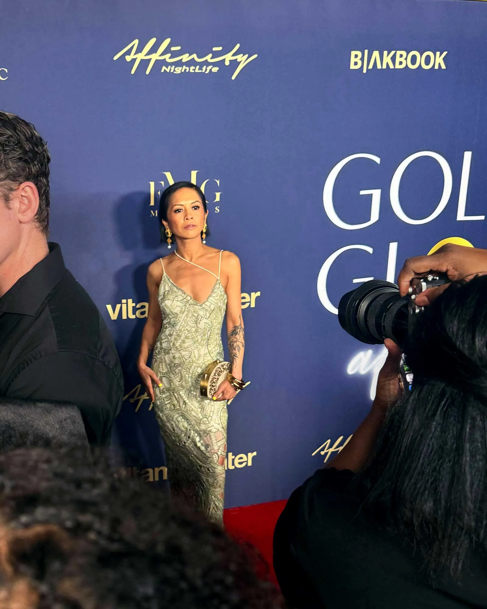 Paired with a matching gold clutch and understated earrings, the look embraces restraint while allowing the dress itself to speak in a language of light. It is both glamorous and grounded, an elegant fusion of contemporary eveningwear and the cultural pride woven through Filipino identity.