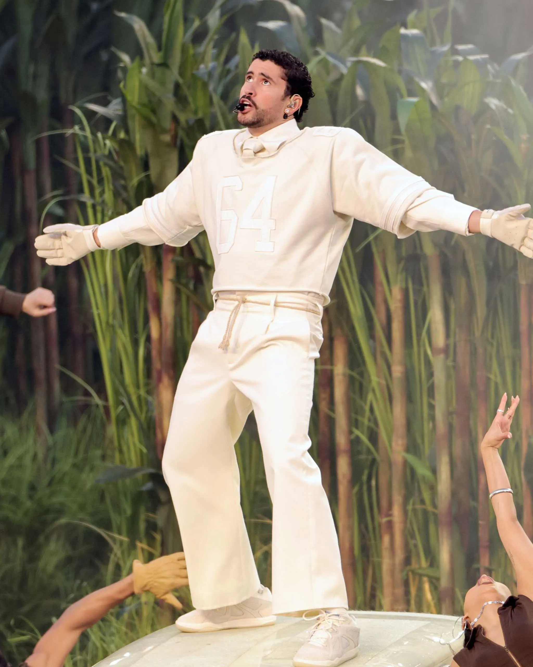Given the musician is always one to embrace bold fashion choices, it was no surprise that Bad Bunny leaned into a distinctive outfit tonight: It was designed by Zara, and unexpectedly pared-back. Styled by his frequent collaborators Storm Pablo and Marvin Douglas Linares, he wore a minimal head-to-toe cream look, including a collared shirt and tie, a sport-inspired jersey with the number 64 on it, chinos, and sneakers. The significance of that number 64? On the back read Ocasio, the last name of his mother, Lysaurie Ocasio; Fans are speculating that 1964 is the year she was born.