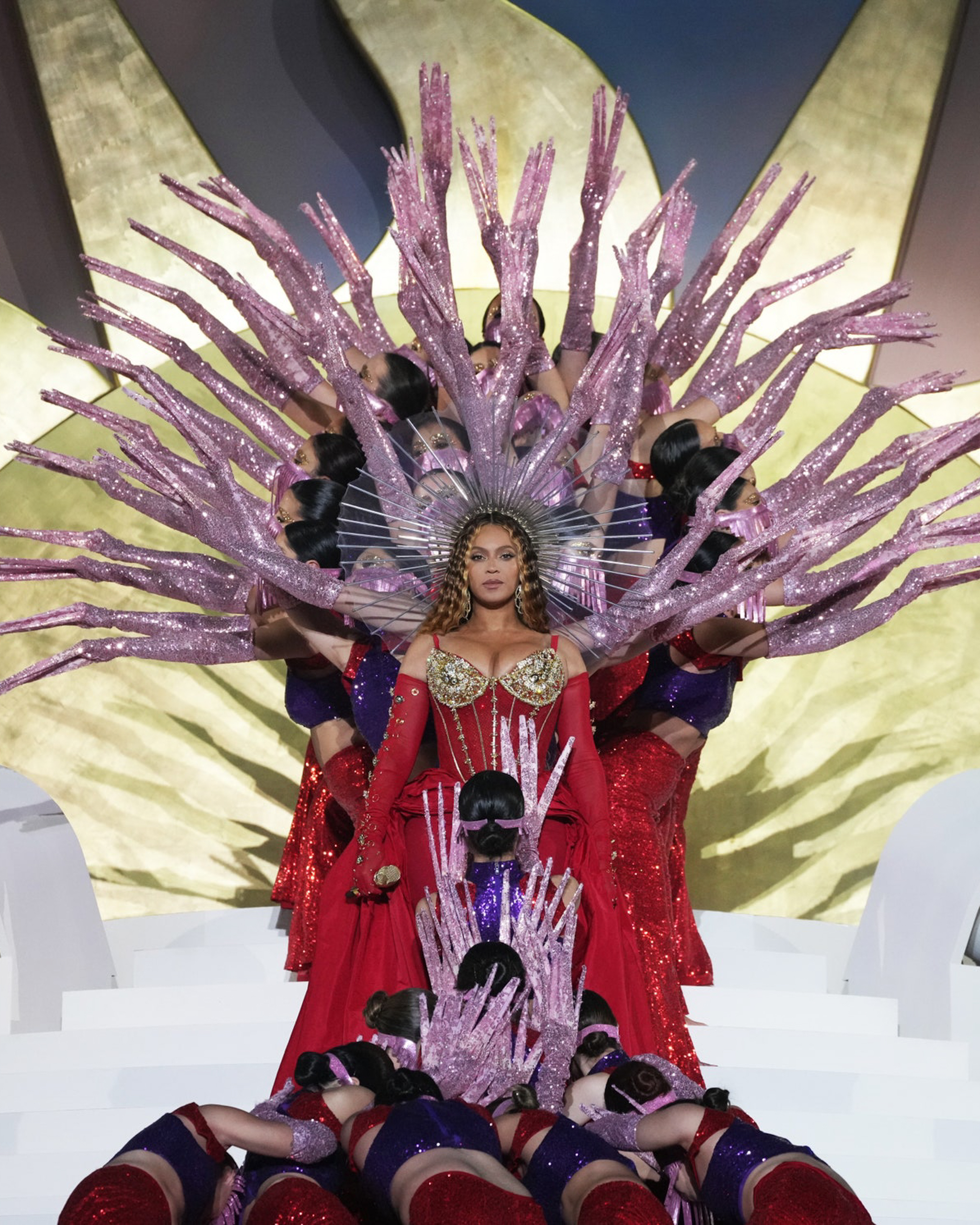 A third of the way through the 75-minute concert, Beyoncé made her first outfit change into a corseted flame-red bodysuit with a matching train and gloves by Nicolas Jebran. It’s not the first time they have worked together. The Lebanese designer—whose list of celebrity clients includes Jennifer Lopez, Gigi Hadid, and Cindy Crawford—first dressed the singer for the MTV Music Awards in 2014, then again for the Grammys in 2018. Jebran says the full-skirted silhouette was inspired by “royal attire” with a nod to “Emirati women” and their love of “gold accessories and monochromatic color.” Fittingly, the costume came complete with a sunburst-style crown and pendant 80 carat diamond earrings from Lorraine Schwartz.