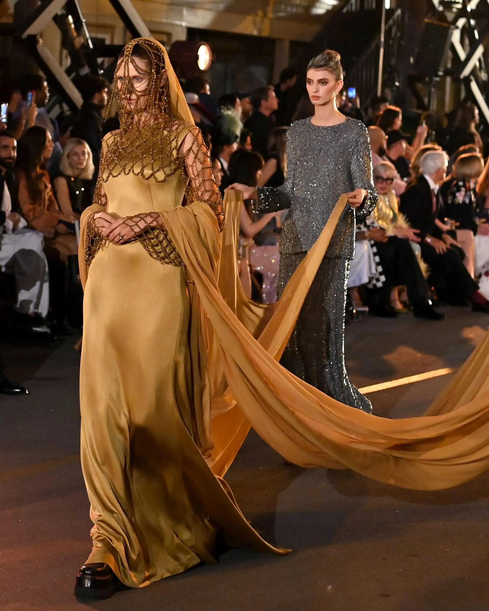Balti hits the runway in the “Brave New World” section of the show wearing the resplendent mustard yellow hooded dress that Lady Jessica dons for her arrival on the desert planet, Arrakis. Lady Jessica, a member of the powerful Bene Gesserit sisterhood, is often seen in veils and face coverings. Balti walks the Paramount Studios runway wearing the gold veil and sleeves made of chains and beads. And, like Ferguson’s character, whose split train is carried by ladies in waiting, Balti is also trailed by models who keep her impressive flowing train off the ground.