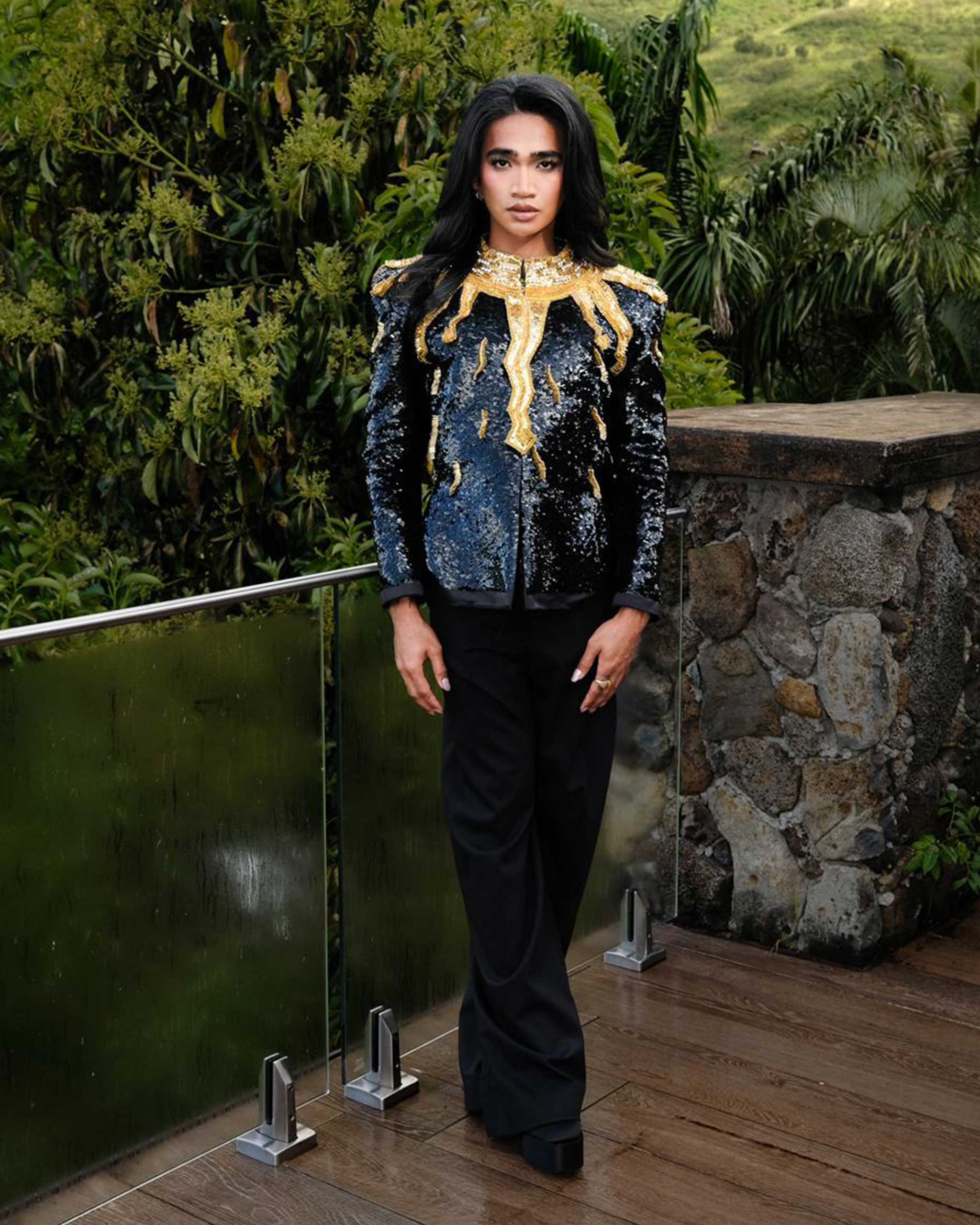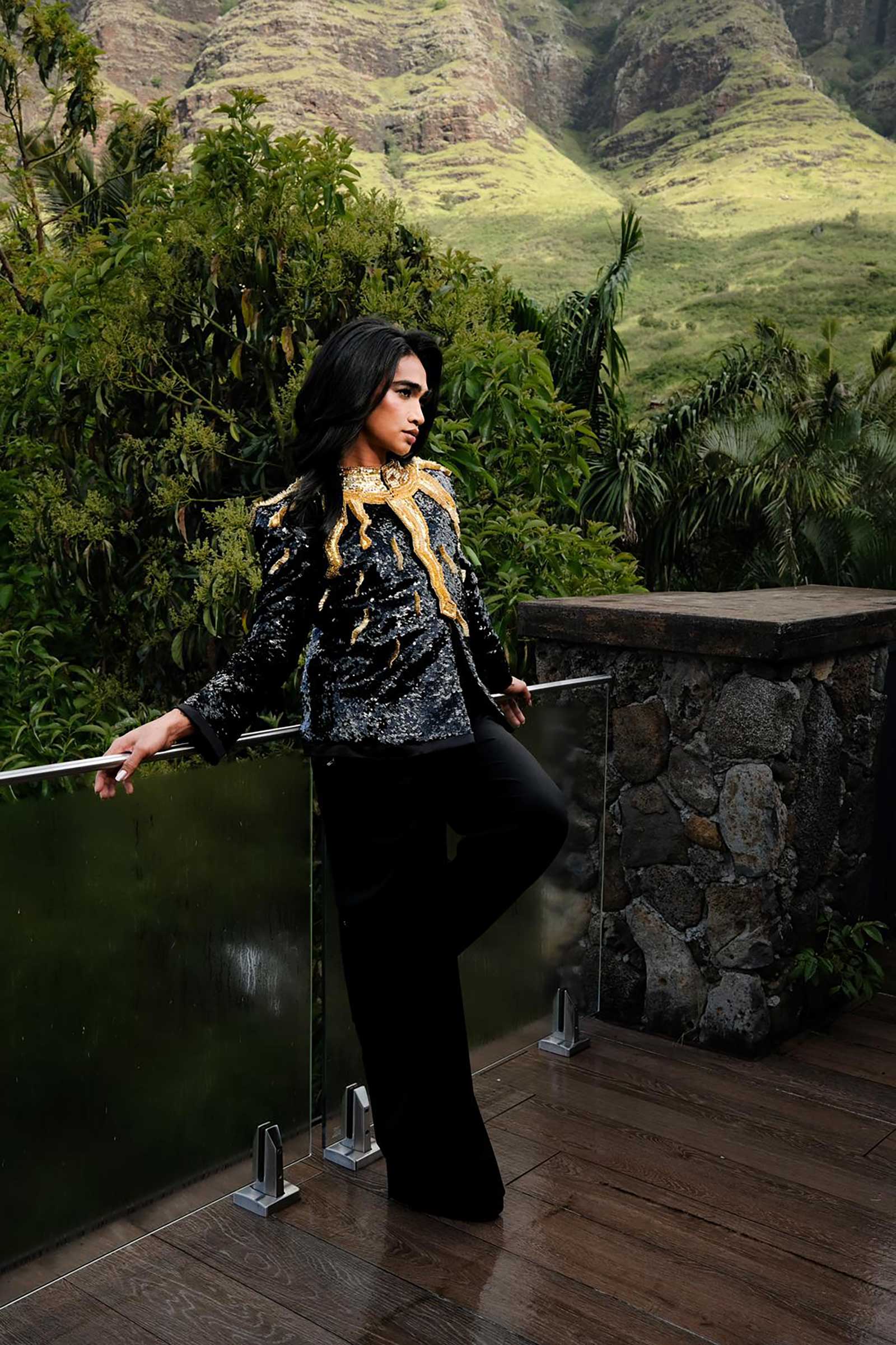 It was a piece that Bretman’s stylist, Brian Meller, instantly gravitated toward. “When I first laid eyes on Jude’s design a few months back, I instantly knew Bretman would love it but we didn’t have the right moment for it yet,” he tells Vogue Philippines. “So when I heard that Bretman was honored by the Hawaiian House of Representatives, the first thing I thought of was Jude’s embellished black jacket with a golden sun design.”