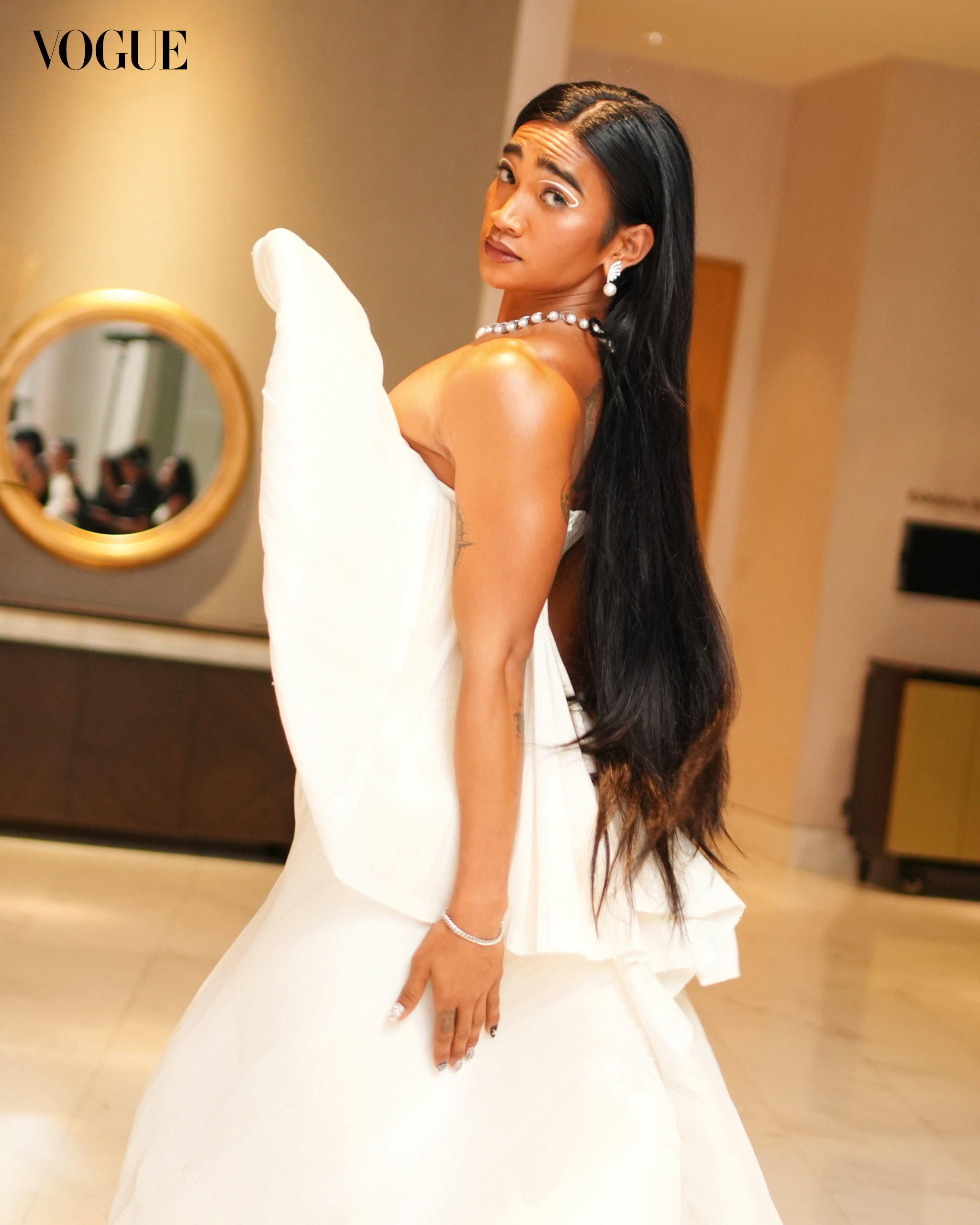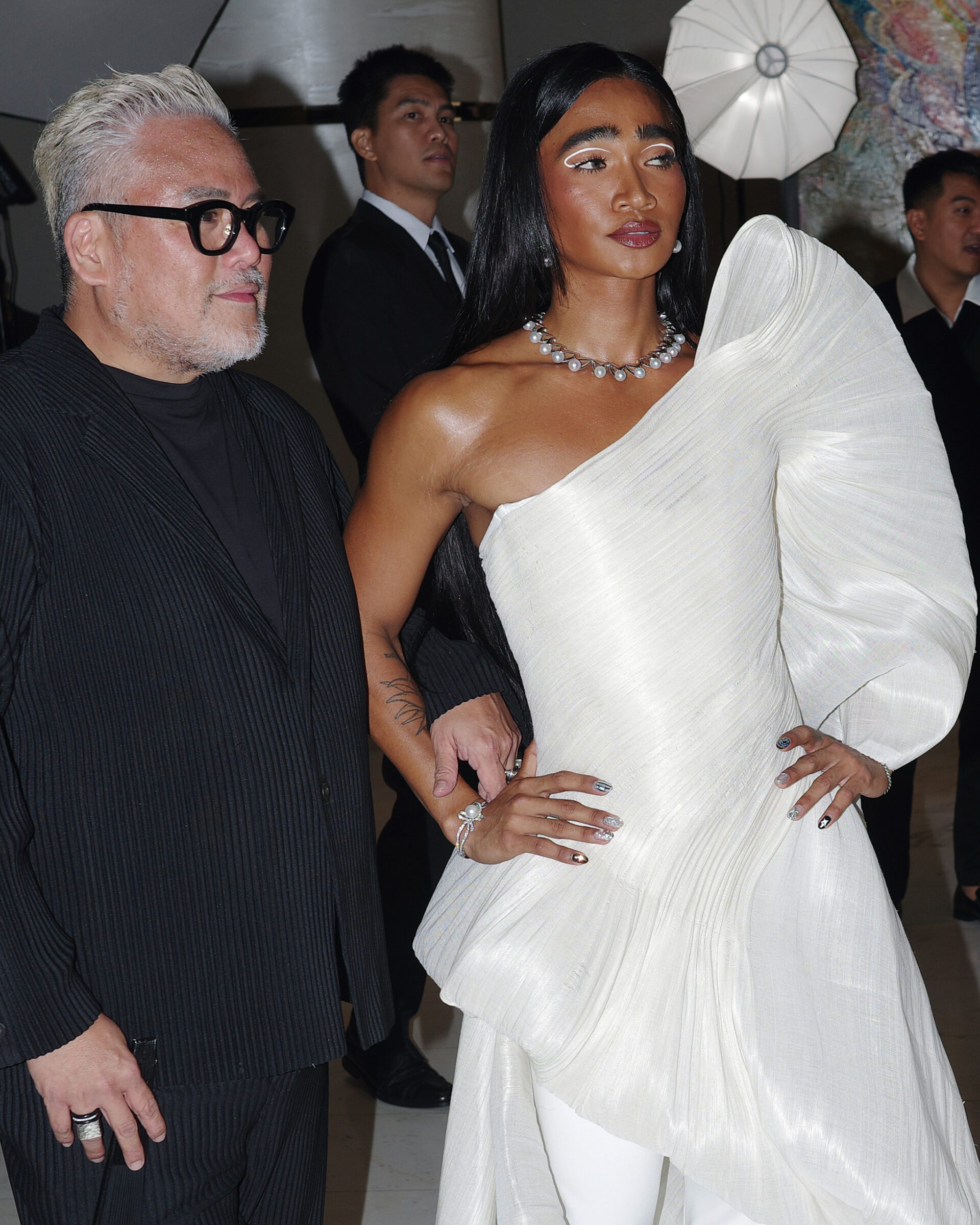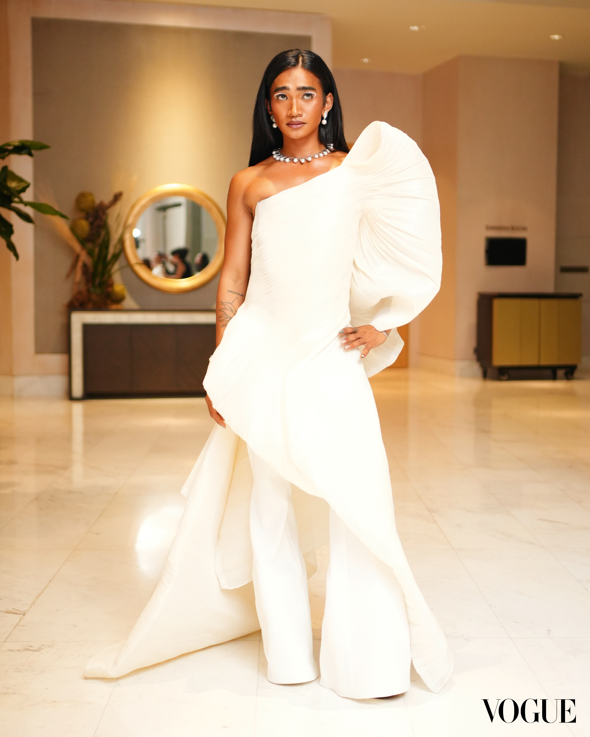 The beauty influencer arrives at the gala with fresh skin and graphic white eyeliner. His hair is slicked back, falling down in long, natural waves. A statement necklace of silver South Sea pearls, complemented with diamond and pearl earrings from Jewelmer, add a touch of fresh shine.