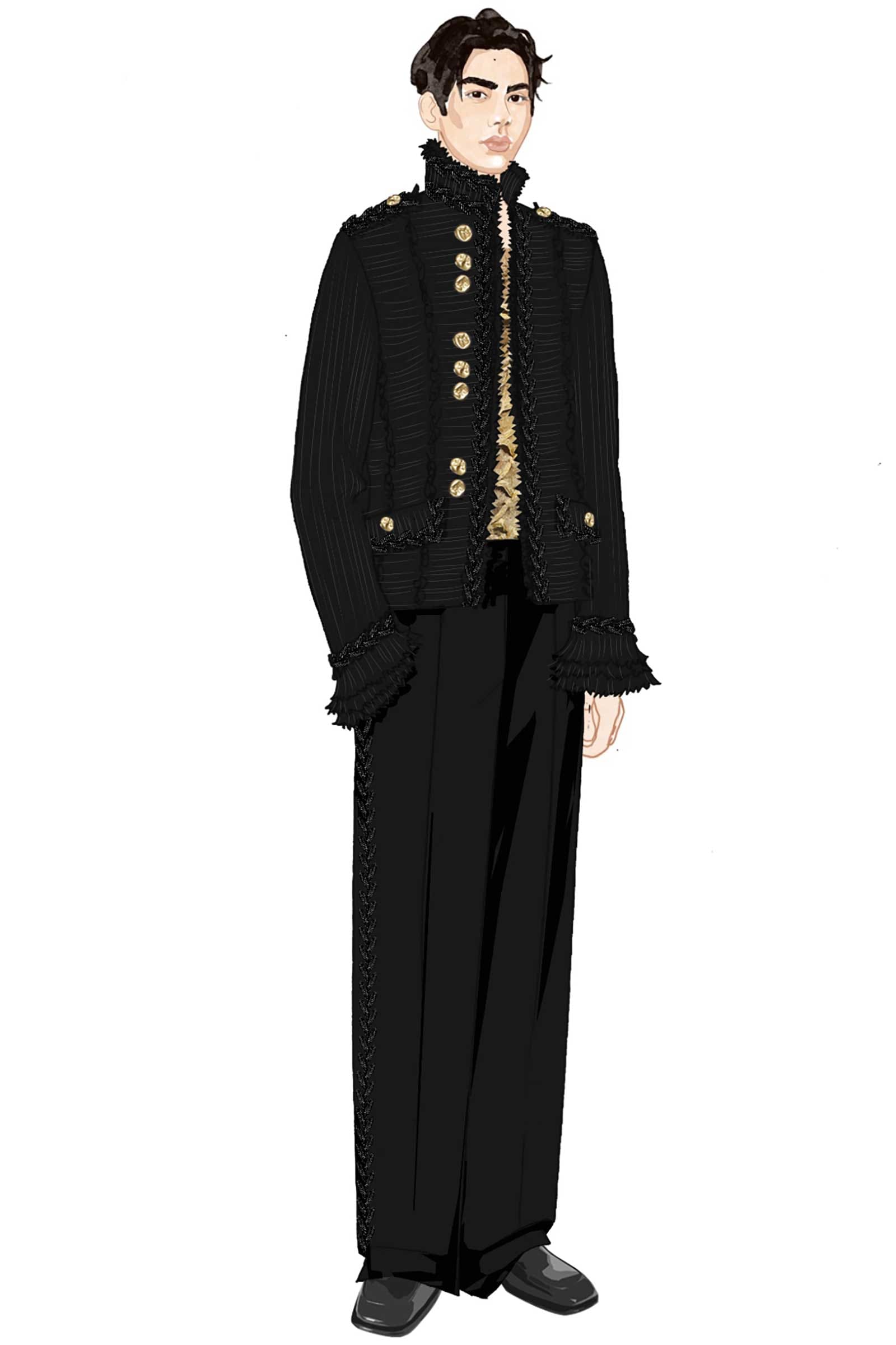 “Bright’s jacket is made entirely out of pleated georgette,” Lee tells Vogue. “The jacket is embroidered with tonal bullion. The wide-legged silk tuxedo trousers have a tonal bullion stripe.” On his feet were black square-toed loafers.