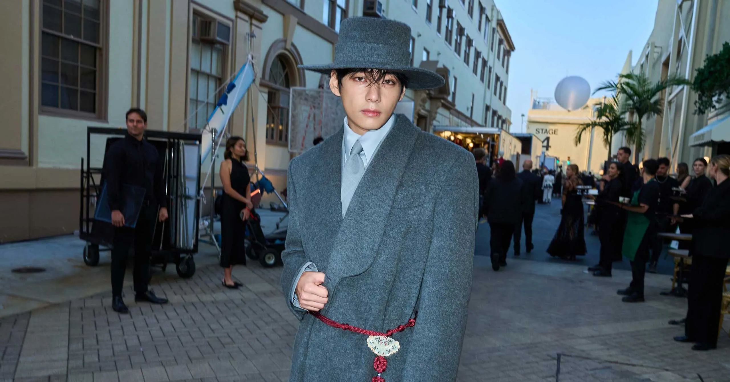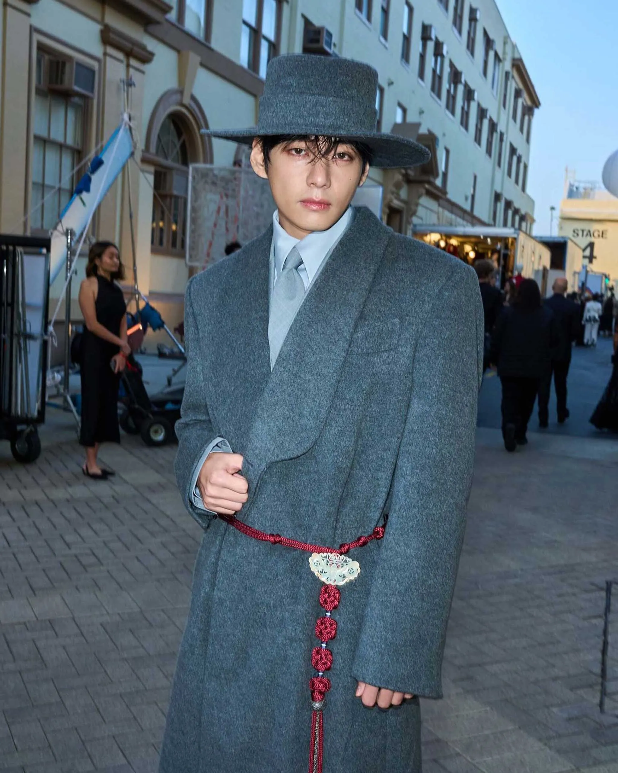 No stranger to a fashion show (he most recently attended Celine’s spring 2026 show in Paris) V, whose full name is Kim Taehyung, arrived in look that could have easily appeared on the runway. He wore a long gray overcoat with a red woven belt accented with norigae—traditional Korean accessories that serve as ornamental good luck charms. He accessorized with a wide-brimmed hat and sleek leather shoes. V’s coat topped a tailored yet relaxed gray suit with a matching tie and a light gray shirt.