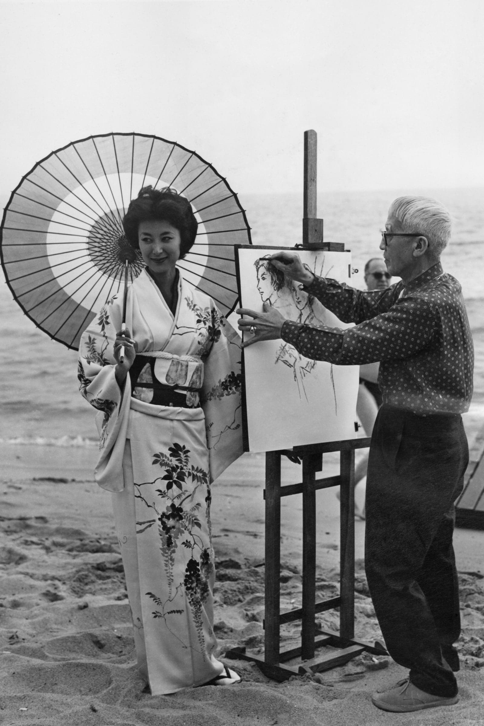 Foujita painting Keiko Kishi, star of Snow Country, on the beach at Cannes, 1958.Photo: Keystone / Hulton Archive / Getty Images