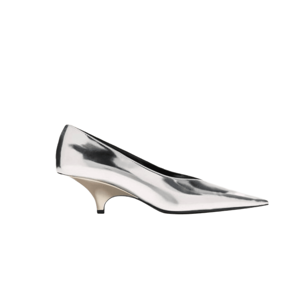 Balance the youthfulness of a denim miniskirt with the ladylike touch of a collared floral top and metallic pumps.