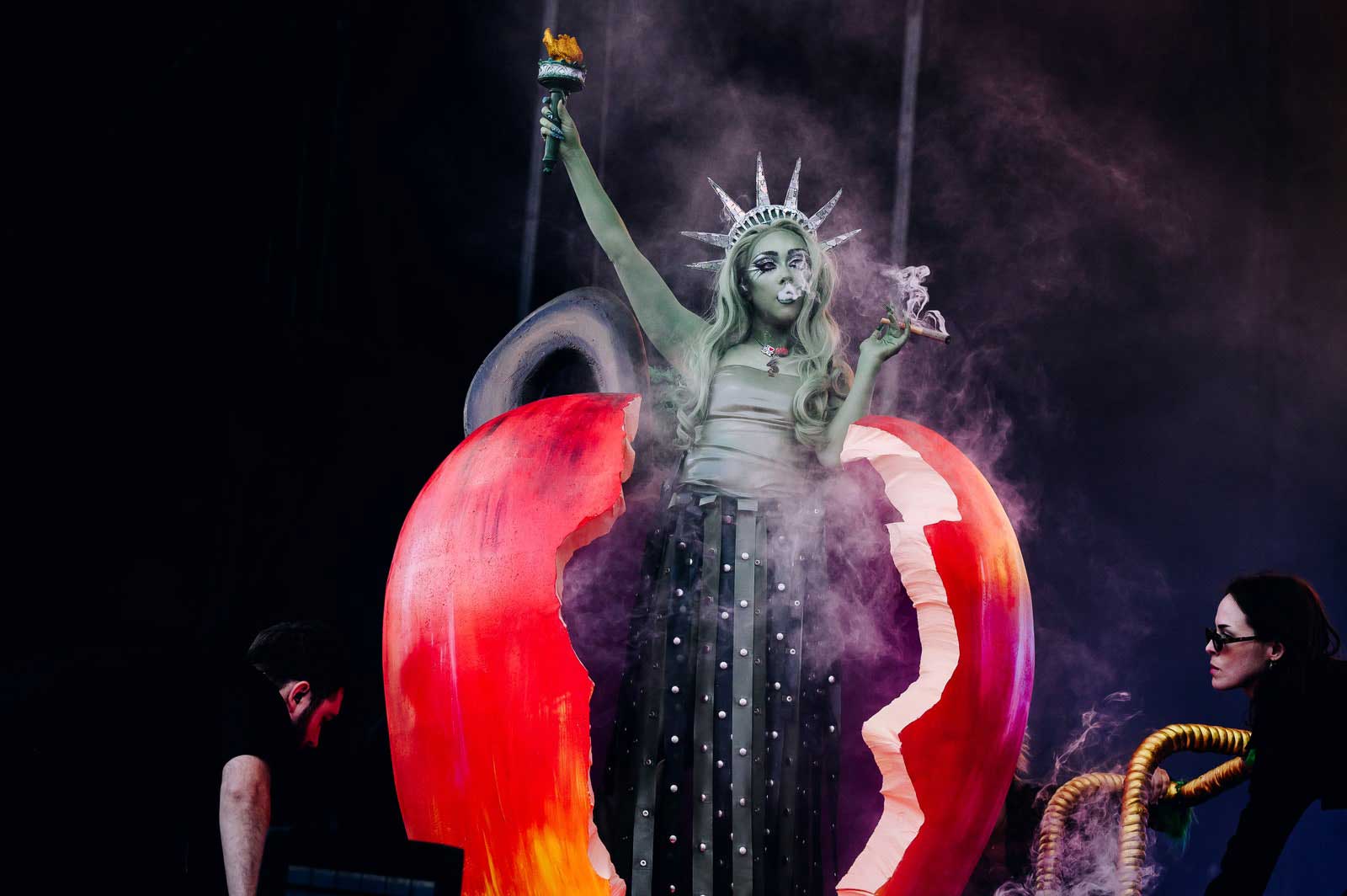 Your favorite artist’s favorite artist hit the stage covered from head to toe in green body paint the color of patinated copper, and covered her signature red curls with a wig to match (featuring the classic spiked crown). But when she emerged from an oversized apple smoking a comically oversized joint, it was safe to say that Chappell Roan was no ordinary Lady Liberty.