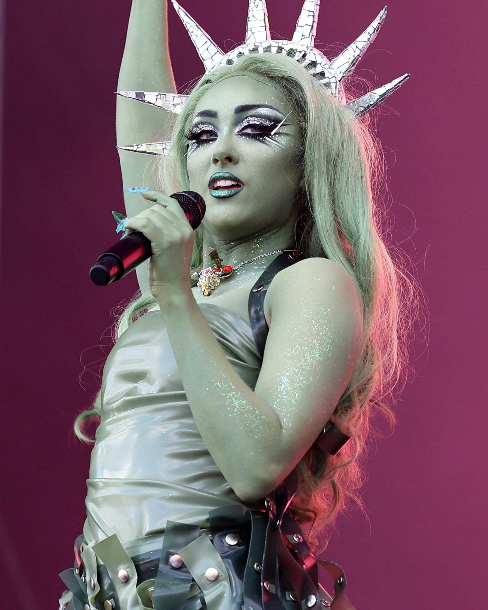 Styled by Genesis Webb, the singer got kinky in a strapless latex top, and a skirt made of strips of studded latex over an assless underskirt from Monique Fei. While the real Lady Liberty wears a stola, Chappell’s assless chaps iteration would make even the statue herself blush. She kept the back of her black and green skirt open, showing off her derriere covered only by a thong the same color as her body paint. Finally, in keeping with her Midwest Princess roots, she added a pair of light green cowboy boots.