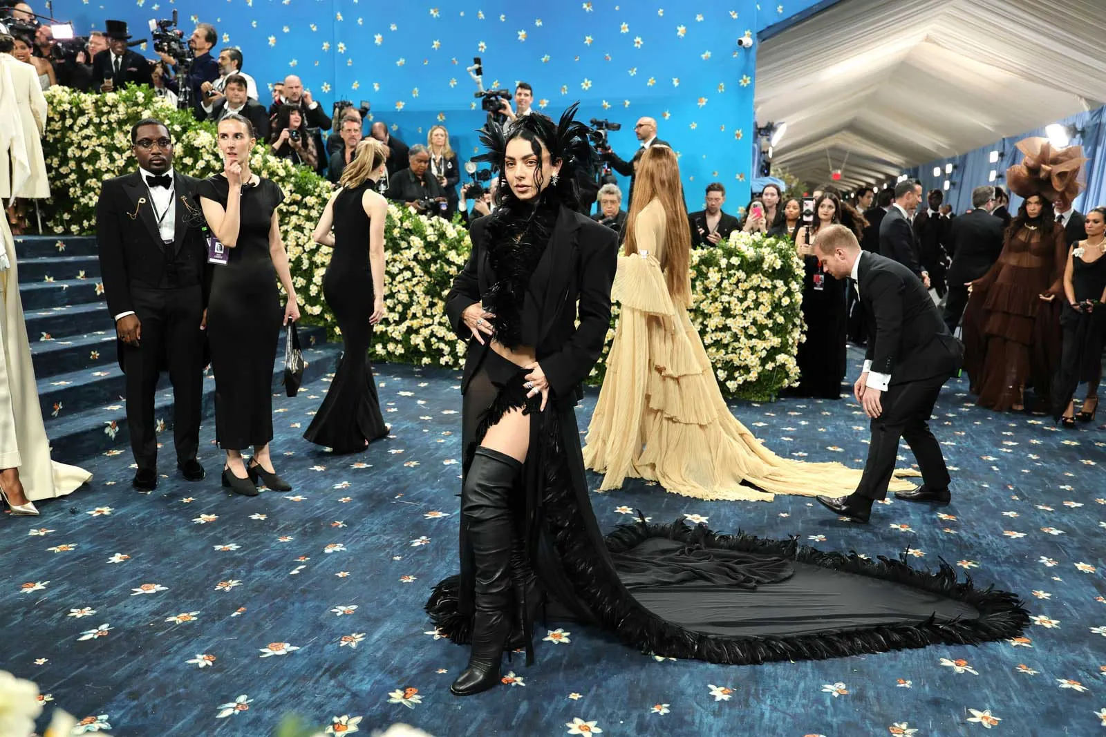 “I have always been a huge fan of Ann Demeulemeester—the house has always spoken to me and felt intrinsically related to my personal style,” Charli tells Vogue. The Belgian brand, known for its moody, androgynous aesthetic, does feel perfectly in tune with the grungy Brat-coded fashion the pop star has developed with her stylist, Chris Horan. “With tailoring being such a key element of this year’s theme and a core part of dandyism itself, I felt like they would be prepared to make something tailored to me but also something that referenced elements of dandyism,” Charli adds. “I’ve always been drawn to how they’ve subverted elements of classic tailoring and how they’ve played with androgyny to create something fearless and unique.”