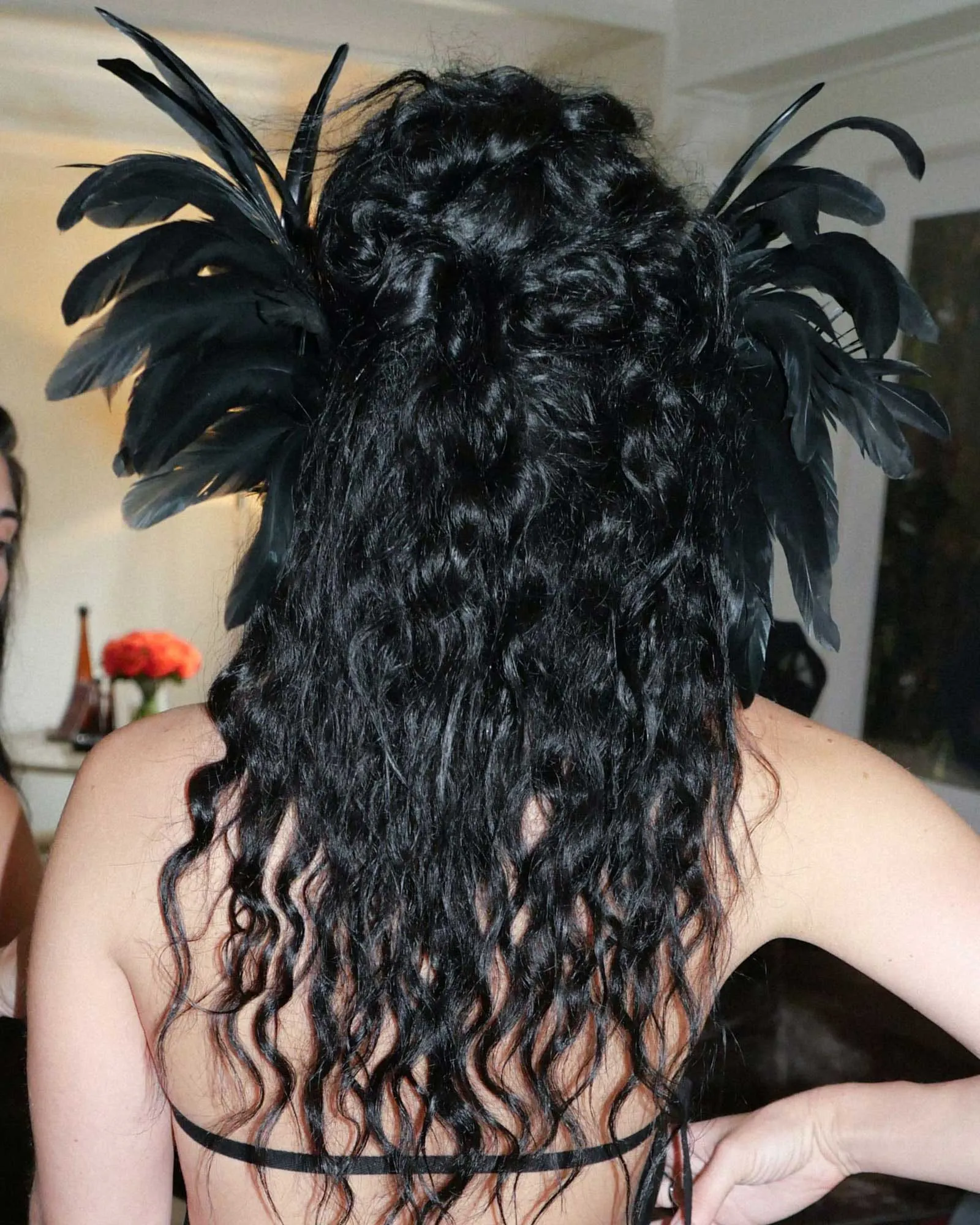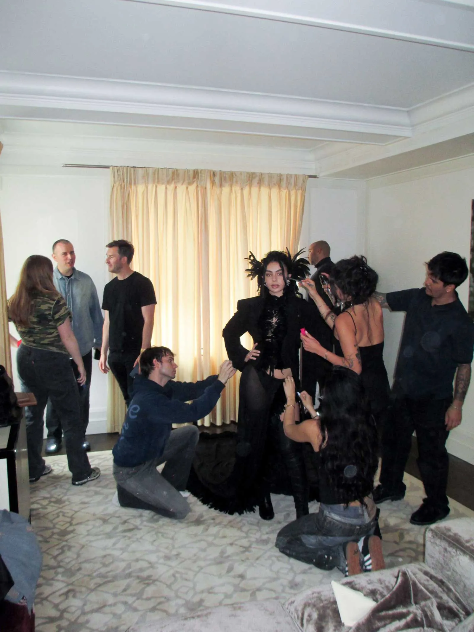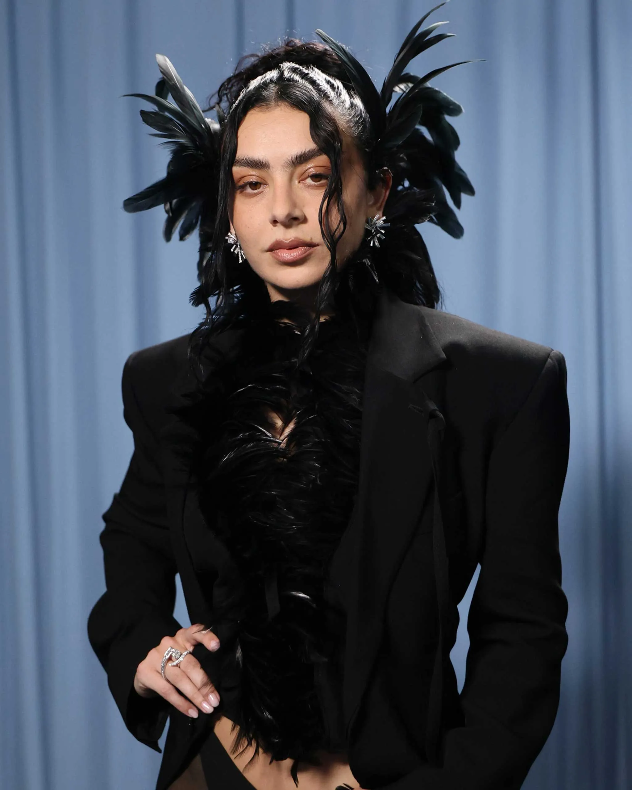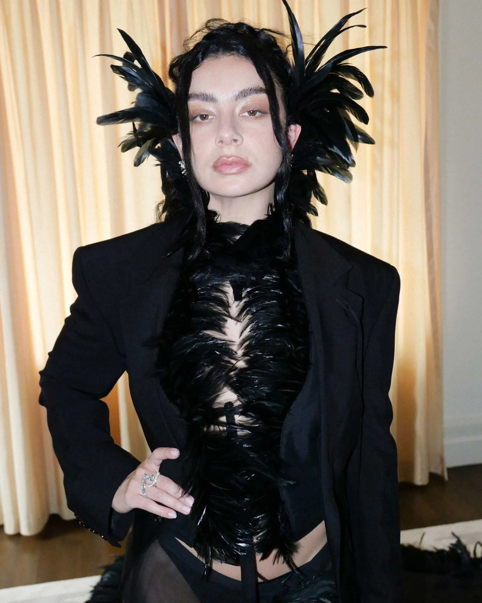 The end result is a fitted blazer, an artfully tailored open-back micro waistcoat and shorts, a sheer silk chiffon train tipped with feathers, thigh-high stretch leather cuissardes, and feathered ear cuffs to heighten the drama—all in Charli’s (and Ann Demuelemeester’s) favored shade of jet black. “At our first fitting, we wanted to make sure all of the lines were cut super-sharp,” says Charli, noting that she wanted the jacket to feel extreme and defined so that the train, with all its movement and ruffles, felt like a “beautiful, almost liquid contrast.”