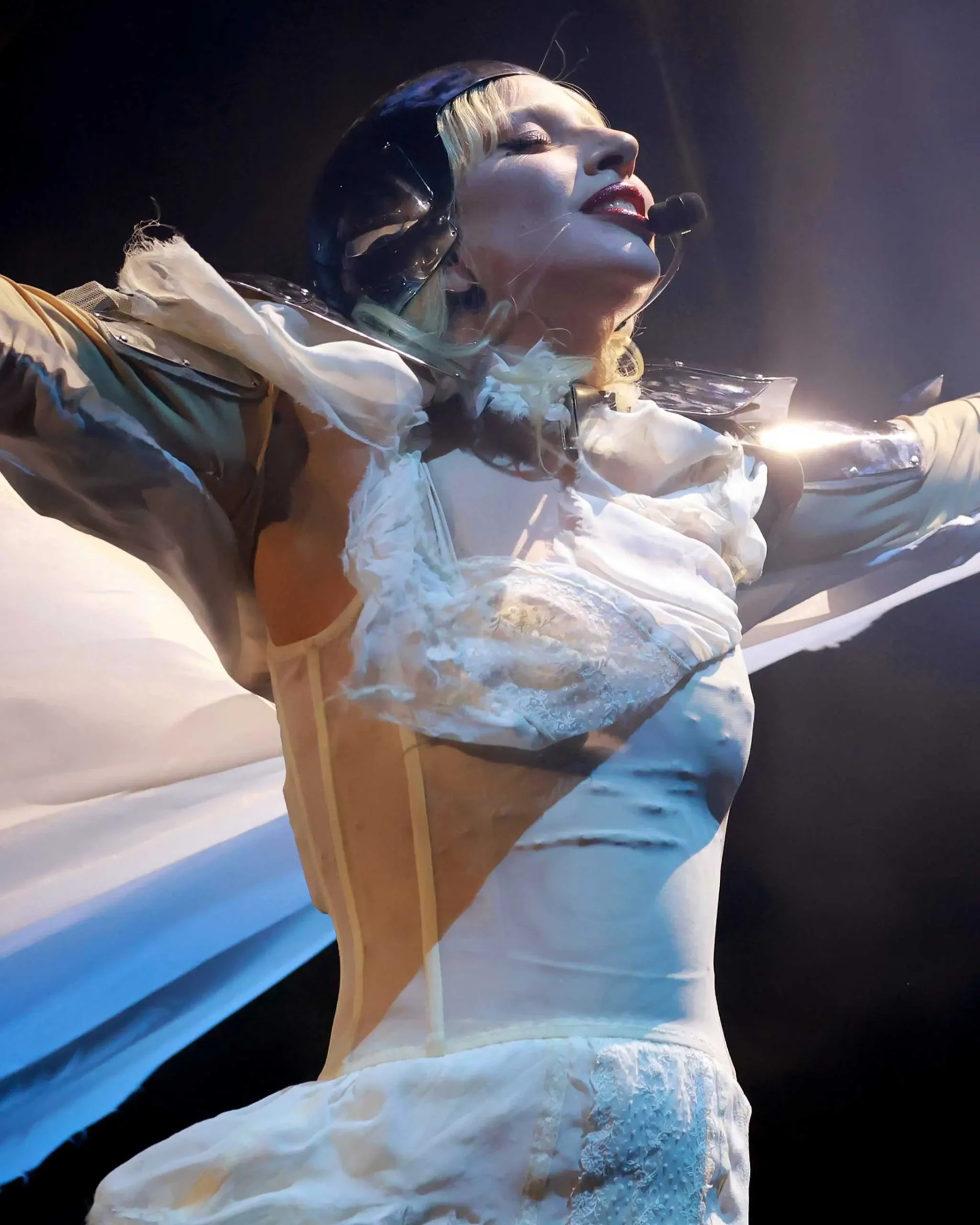 In Act two, Gaga then appeared on-stage buried in sand next to skeletons, to sing her new song “Perfect Celebrity.” Her ethereal, white corseted gown was made by Turkish-British Dilara Findikoglu, a celebrity favorite often worn by the likes of fellow Coachella performer Charli xcx, Rosalia, and Julia Fox. (The boney skeletons and masks were made specially by the artist Sarah Sitkin, known for her sculptural, body reverential work).