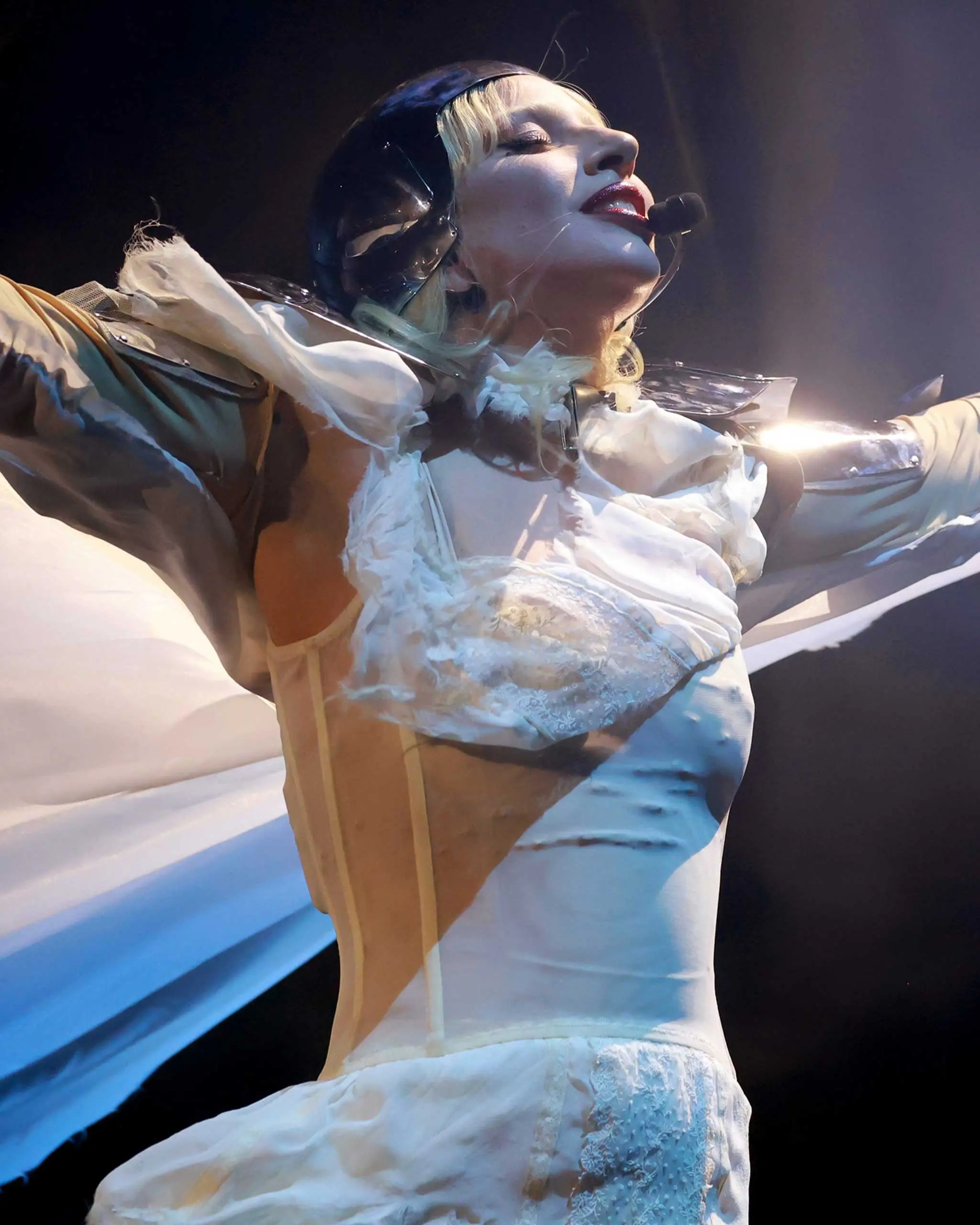 As the show progressed, the artist’s stage ensembles only got more elaborate and ornate. For her performance of “Paparazzi,” for one, she slipped into silver metallic armor pieces by Manuel Albarran—an expert in metal couture—that mimicked the robotic look she sported in the iconic 2009 music video. For act three, when she performed new tracks like “Killah,” Gaga dressed up in the sprightly designs of Marni’s Francesco Risso, including a feathered blue coat and bedazzled bodysuit to strut down the stage catwalk.