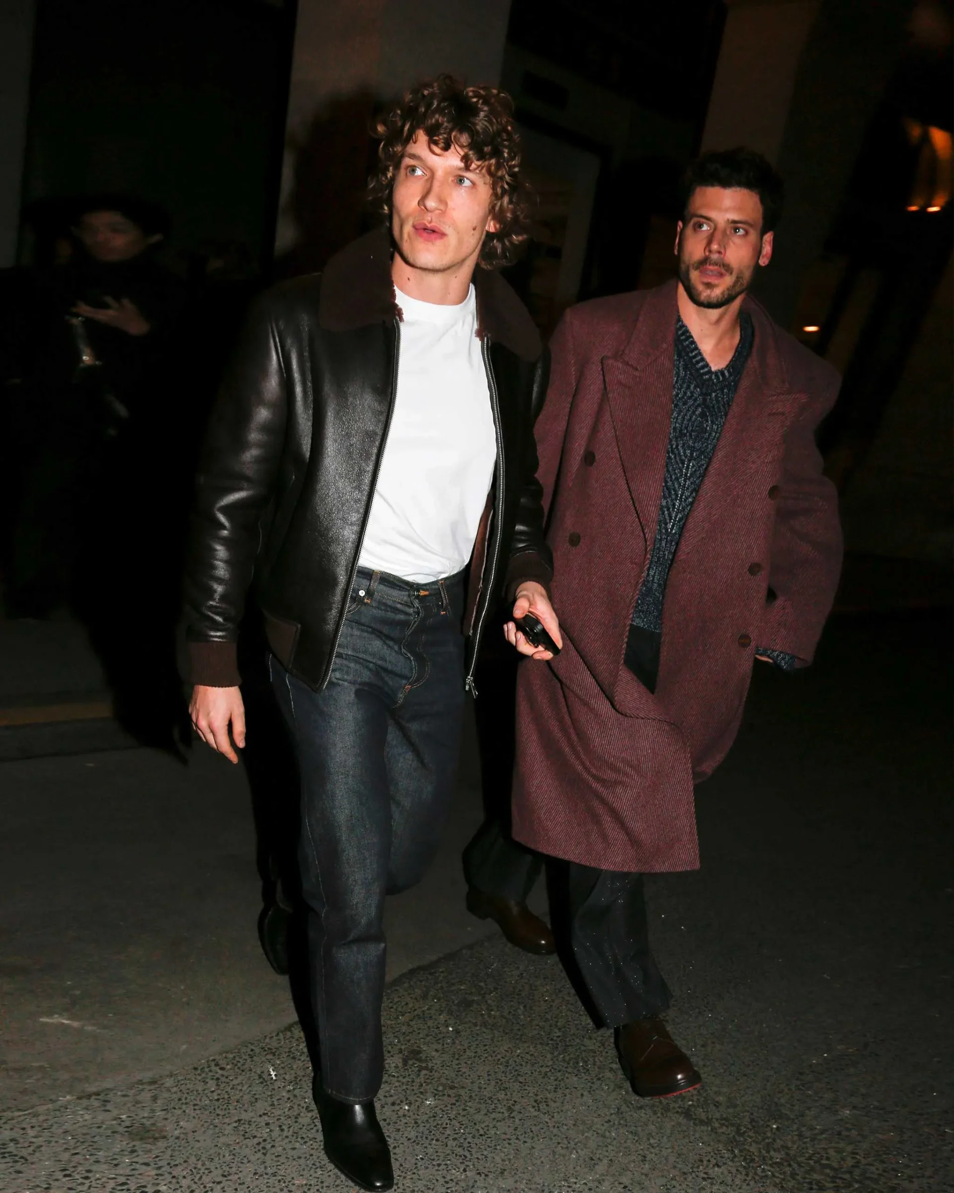 For the outing, Arnaud wore a double-breasted wool coat layered over a chunky V-neck knit, wide-leg trousers, and lace-up boots, while Storrie gave his best James Dean in a leather aviator jacket, a white T-shirt, high-waisted jeans, and ankle boots.