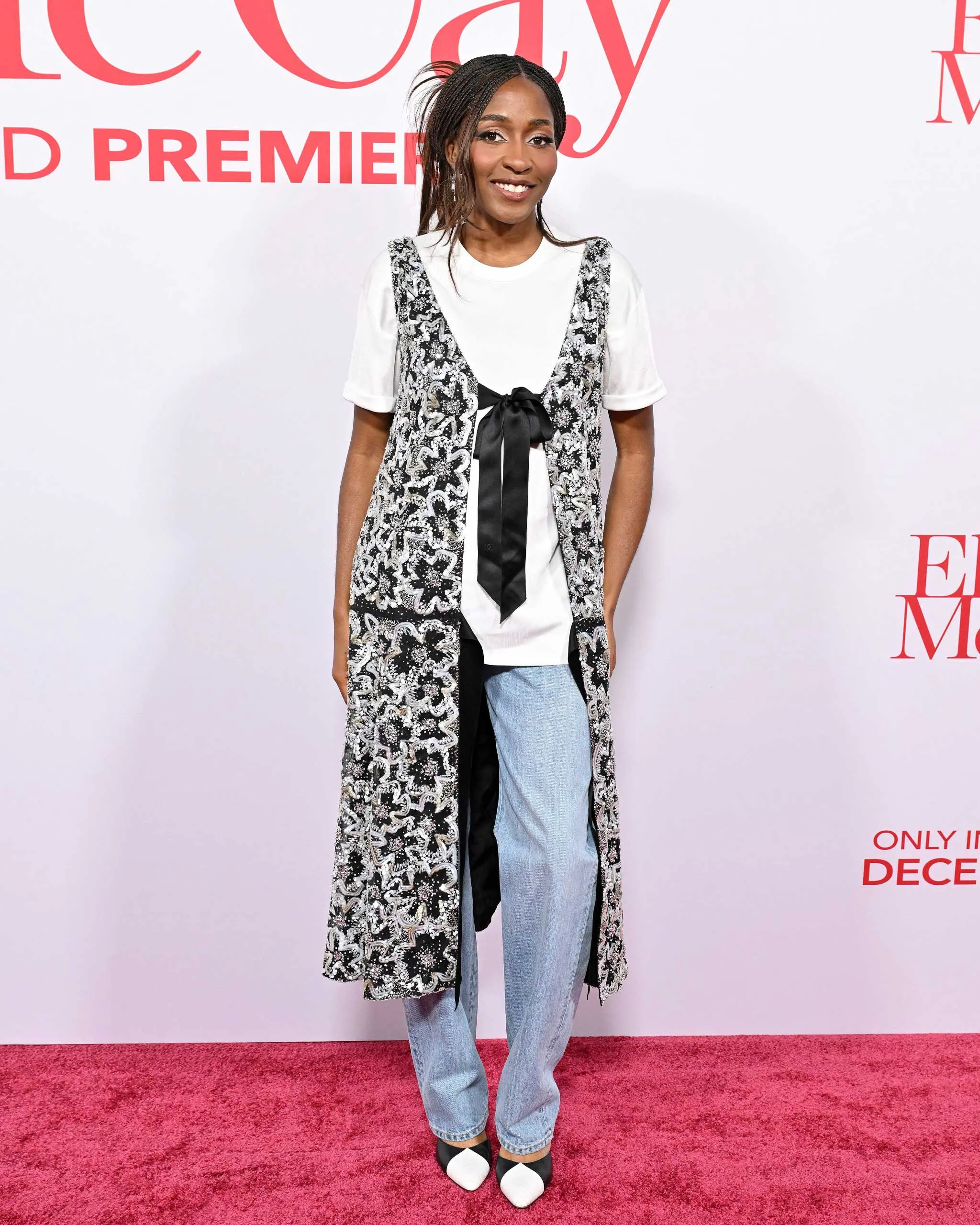 This month, we got two different takes on the trend. For the Los Angeles premiere of Ella McCay, star Ayo Edebiri wore a long, embroidered vest over a classic white tee and jeans, all from Chanel’s pre-fall collection. Was it actually a dress over jeans? No—but the layered silhouettes felt in the same spirit.
