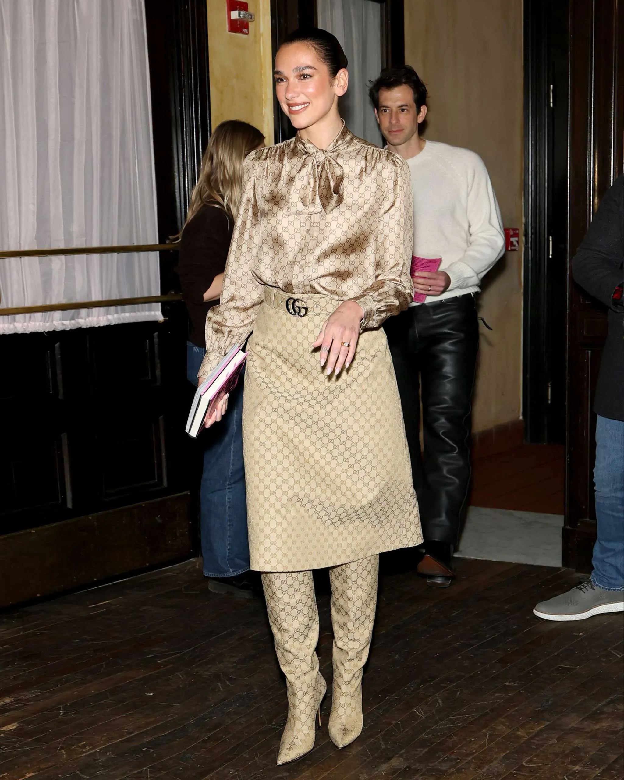 She wore a top-to-toe Gucci spring 2026 look as designed by Demna, sporting a pussybow blouse, a-line knee-length skirt cinched with with an interlocking double G, a Jackie bag, and pointed knee-high boots in monochromatic creams, stamped all-over in the familiar Gucci monogram. Her only exceptions to staying committed to the Gucci bit were a Nour Hammour fuzzy trimmed suede black coat and her custom, chunky gold Tiffany & Co. engagement ring from fiancé Callum Turner.